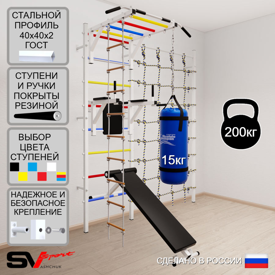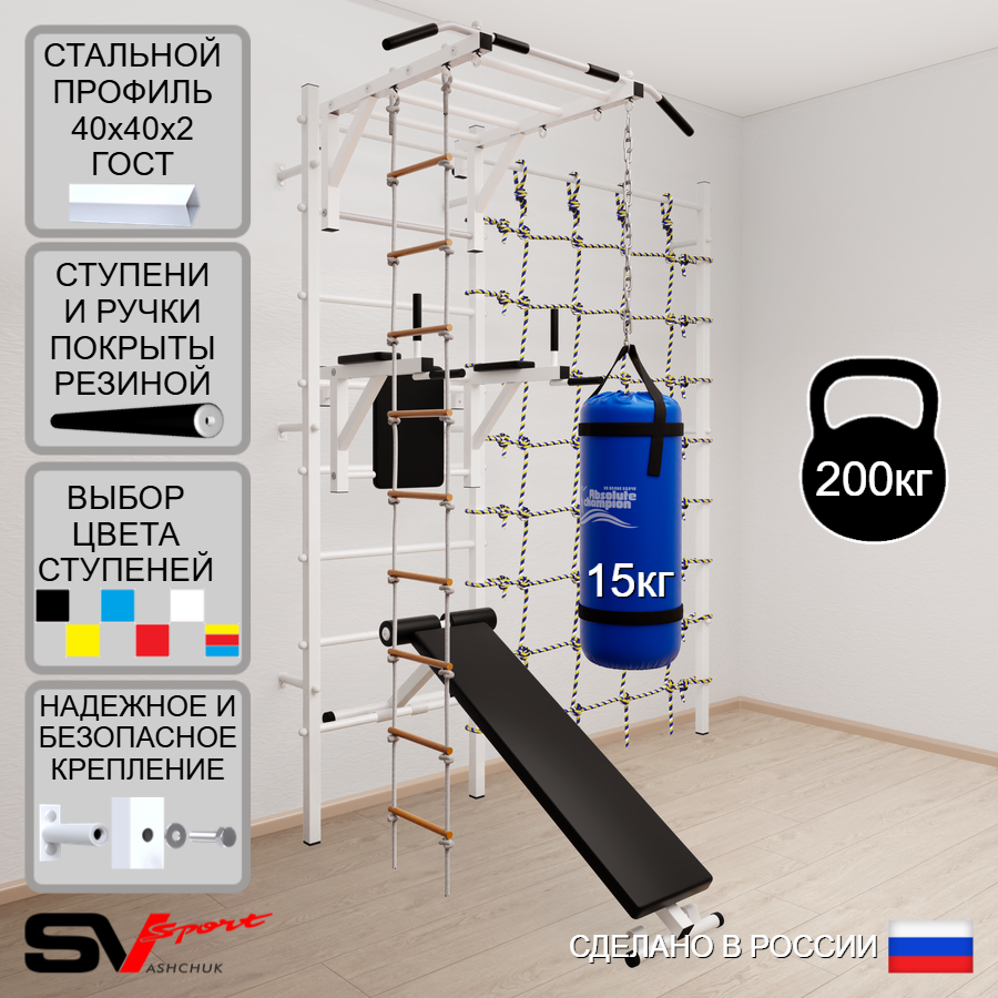КОМПЛЕКТАЦИЯ: Шведская стенка Sv Sport (профиль вертикальных стоек 40 х 40 х 2 мм), Турник Sv Sport рукоход к ШС, Брусья Sv Sport к ШС, Скамья для пресса и жима Sv Sport к ШС, Лестница веревочная, Цепь удлинитель 90см, Мешок боксерский 15кг, Канатный лаз.