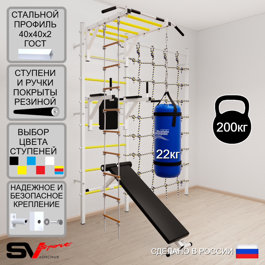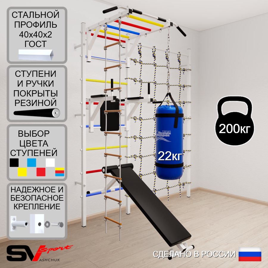 КОМПЛЕКТАЦИЯ: Шведская стенка Sv Sport (профиль вертикальных стоек 40 х 40 х 2 мм), Турник Sv Sport рукоход к ШС, Брусья Sv Sport к ШС, Скамья для пресса и жима Sv Sport к ШС, Лестница веревочная, Цепь удлинитель 90см, Мешок боксерский 22кг, Канатный лаз.
