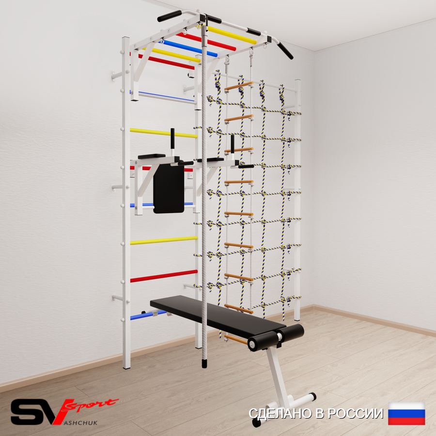 КОМПЛЕКТАЦИЯ: Шведская стенка Sv Sport (профиль вертикальных стоек 40 х 40 х 2 мм), Турник Sv Sport рукоход к ШС, Брусья Sv Sport к ШС, Скамья для пресса и жима Sv Sport к ШС, Kанат, Лестница веревочная, Канатный лаз.