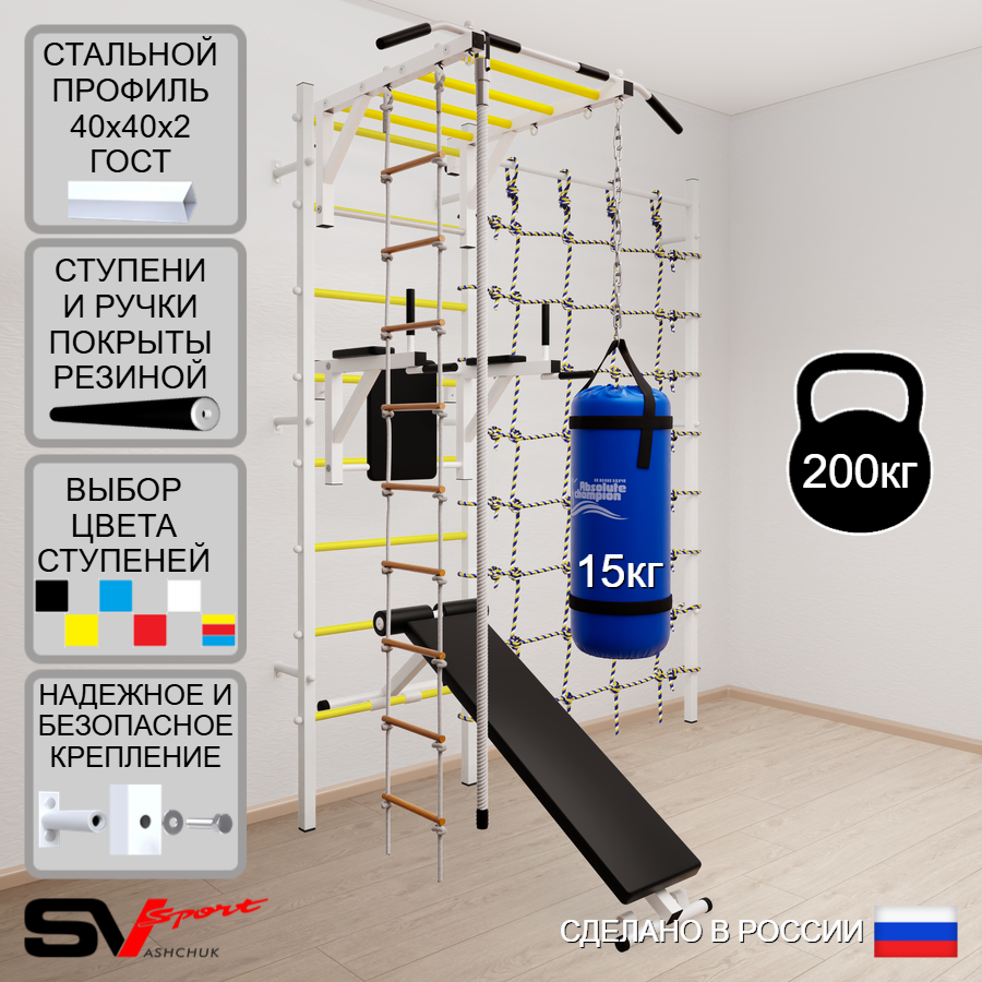 КОМПЛЕКТАЦИЯ: Шведская стенка Sv Sport (профиль вертикальных стоек 40 х 40 х 2 мм), Турник Sv Sport рукоход к ШС, Брусья Sv Sport к ШС, Скамья для пресса и жима Sv Sport к ШС, Kанат, Лестница веревочная, Цепь удлинитель 90см, Мешок боксерский 15кг, Канатный лаз.
