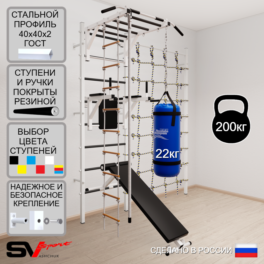 КОМПЛЕКТАЦИЯ: Шведская стенка Sv Sport (профиль вертикальных стоек 40 х 40 х 2 мм), Турник Sv Sport рукоход к ШС, Брусья Sv Sport к ШС, Скамья для пресса и жима Sv Sport к ШС, Kанат, Лестница веревочная, Цепь удлинитель 90см, Мешок боксерский 22кг, Канатный лаз.