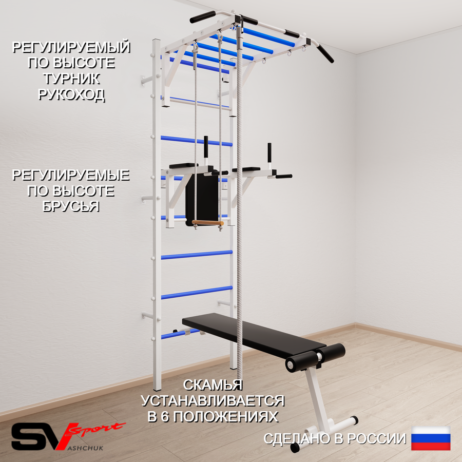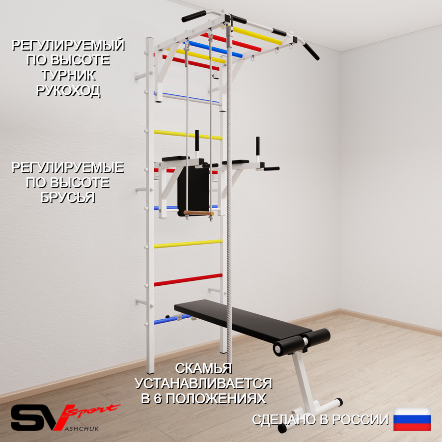 КОМПЛЕКТАЦИЯ: Шведская стенка Sv Sport (профиль вертикальных стоек 40 х 40 х 2 мм), Турник Sv Sport рукоход к ШС, Брусья Sv Sport к ШС, Скамья для пресса и жима Sv Sport к ШС, Kанат, Трапеция.