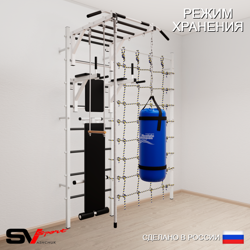 КОМПЛЕКТАЦИЯ: Шведская стенка Sv Sport (профиль вертикальных стоек 40 х 40 х 2 мм), Турник Sv Sport рукоход к ШС, Брусья Sv Sport к ШС, Скамья для пресса и жима Sv Sport к ШС, Kанат, Трапеция, Цепь удлинитель 90см, Мешок боксерский 15кг, Канатный лаз.