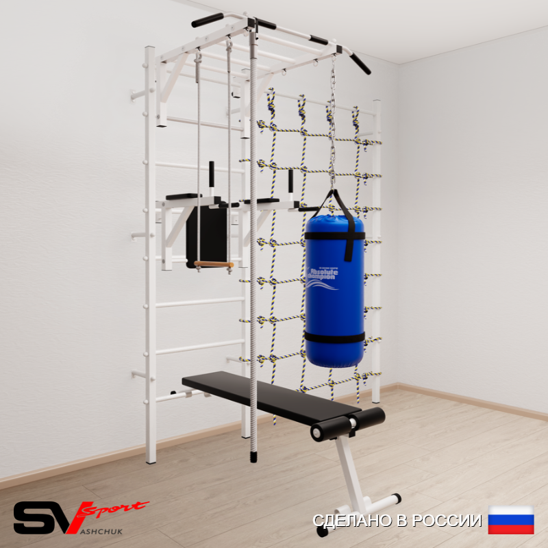 КОМПЛЕКТАЦИЯ: Шведская стенка Sv Sport (профиль вертикальных стоек 40 х 40 х 2 мм), Турник Sv Sport рукоход к ШС, Брусья Sv Sport к ШС, Скамья для пресса и жима Sv Sport к ШС, Kанат, Трапеция, Цепь удлинитель 90см, Мешок боксерский 30кг, Канатный лаз.