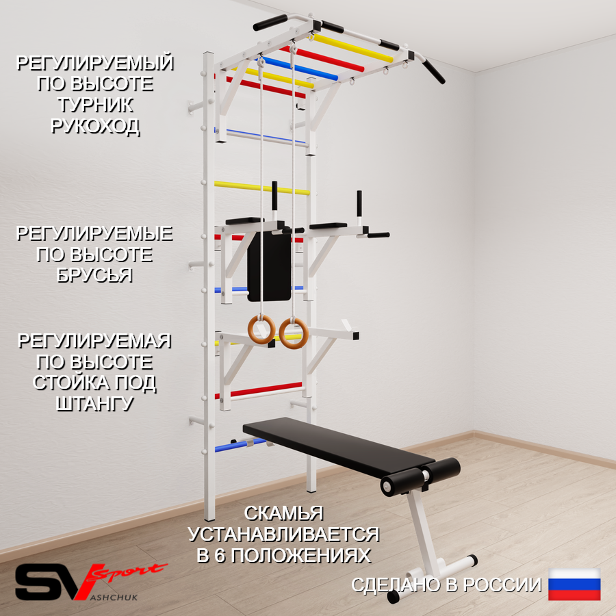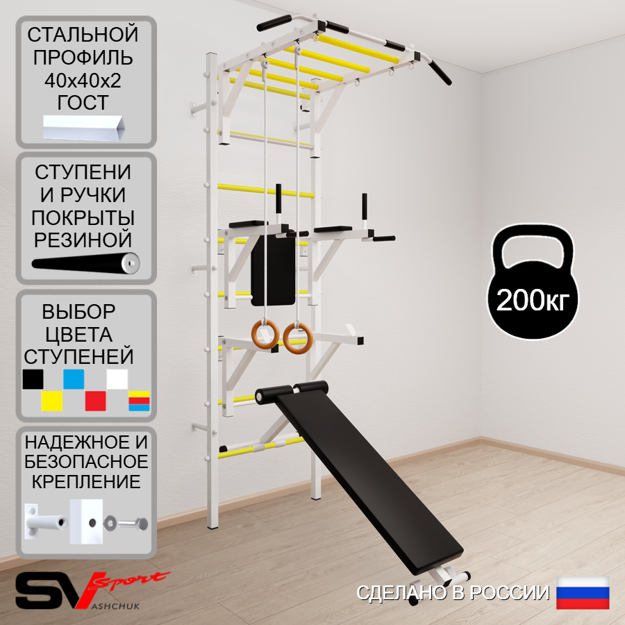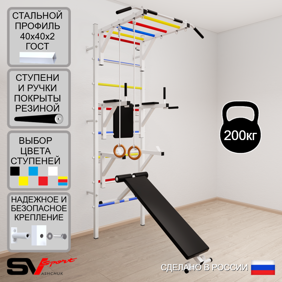 КОМПЛЕКТАЦИЯ: Шведская стенка Sv Sport (профиль вертикальных стоек 40 х 40 х 2 мм), Турник Sv Sport рукоход к ШС, Брусья Sv Sport к ШС, Стойка под штангу Sv Sport к ШС, Скамья для пресса и жима Sv Sport к ШС, Kольца деревянные.