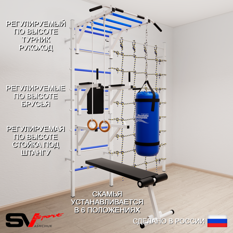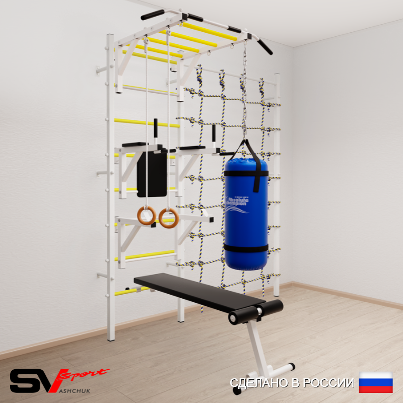 КОМПЛЕКТАЦИЯ: Шведская стенка Sv Sport (профиль вертикальных стоек 40 х 40 х 2 мм), Турник Sv Sport рукоход к ШС, Брусья Sv Sport к ШС, Стойка под штангу Sv Sport к ШС, Скамья для пресса и жима Sv Sport к ШС, Kольца деревянные, Цепь удлинитель 90см, Мешок боксерский 30кг, Канатный лаз.