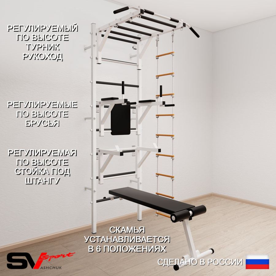 КОМПЛЕКТАЦИЯ: Шведская стенка Sv Sport (профиль вертикальных стоек 40 х 40 х 2 мм), Турник Sv Sport рукоход к ШС, Брусья Sv Sport к ШС, Стойка под штангу Sv Sport к ШС, Скамья для пресса и жима Sv Sport к ШС, Лестница веревочная.