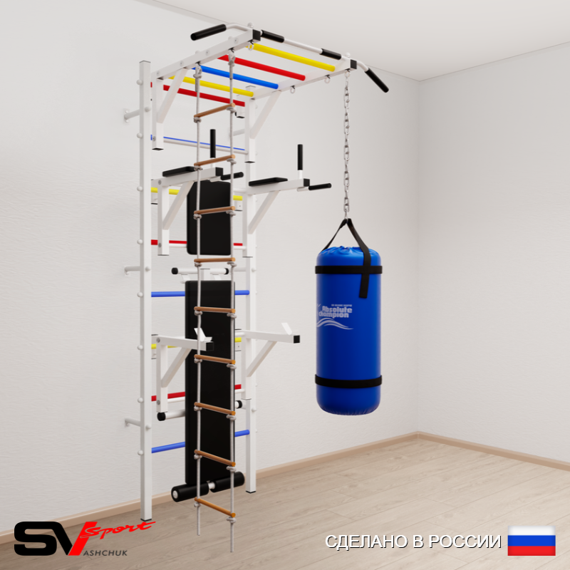 КОМПЛЕКТАЦИЯ: Шведская стенка Sv Sport (профиль вертикальных стоек 40 х 40 х 2 мм), Турник Sv Sport рукоход к ШС, Брусья Sv Sport к ШС, Стойка под штангу Sv Sport к ШС, Скамья для пресса и жима Sv Sport к ШС, Лестница веревочная, Цепь удлинитель 90см, Мешок боксерский 15кг.