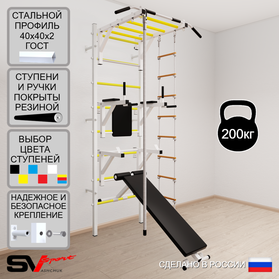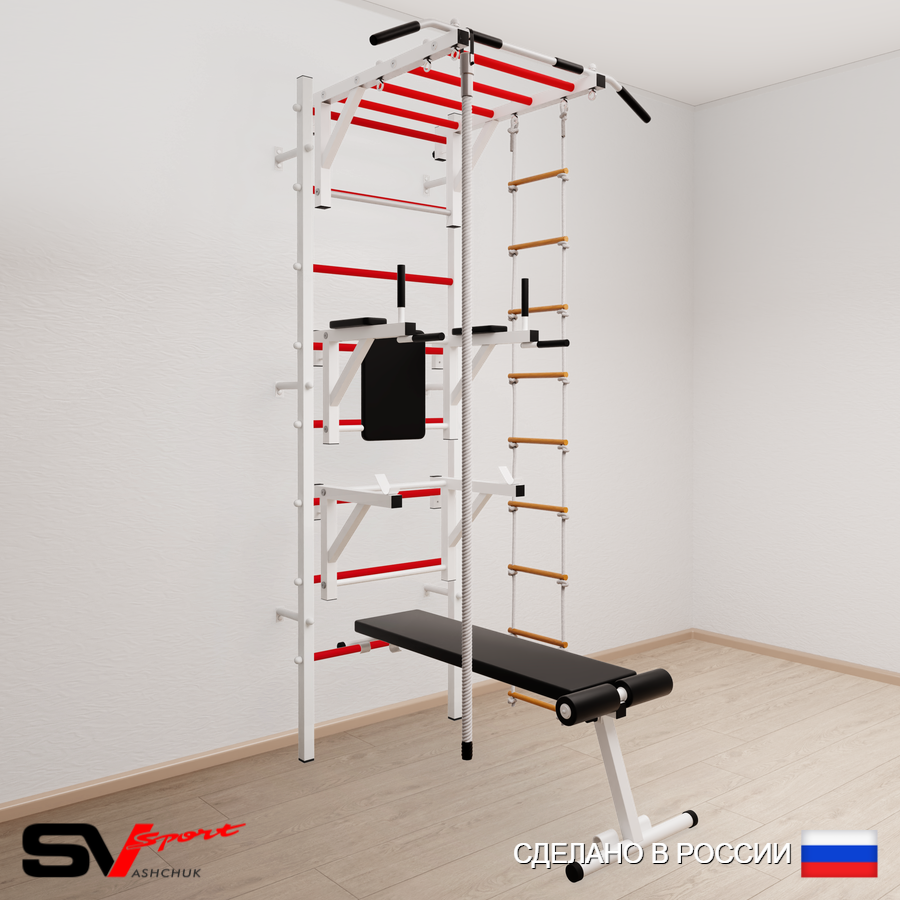 КОМПЛЕКТАЦИЯ: Шведская стенка Sv Sport (профиль вертикальных стоек 40 х 40 х 2 мм), Турник Sv Sport рукоход к ШС, Брусья Sv Sport к ШС, Стойка под штангу Sv Sport к ШС, Скамья для пресса и жима Sv Sport к ШС, Kанат, Лестница веревочная.