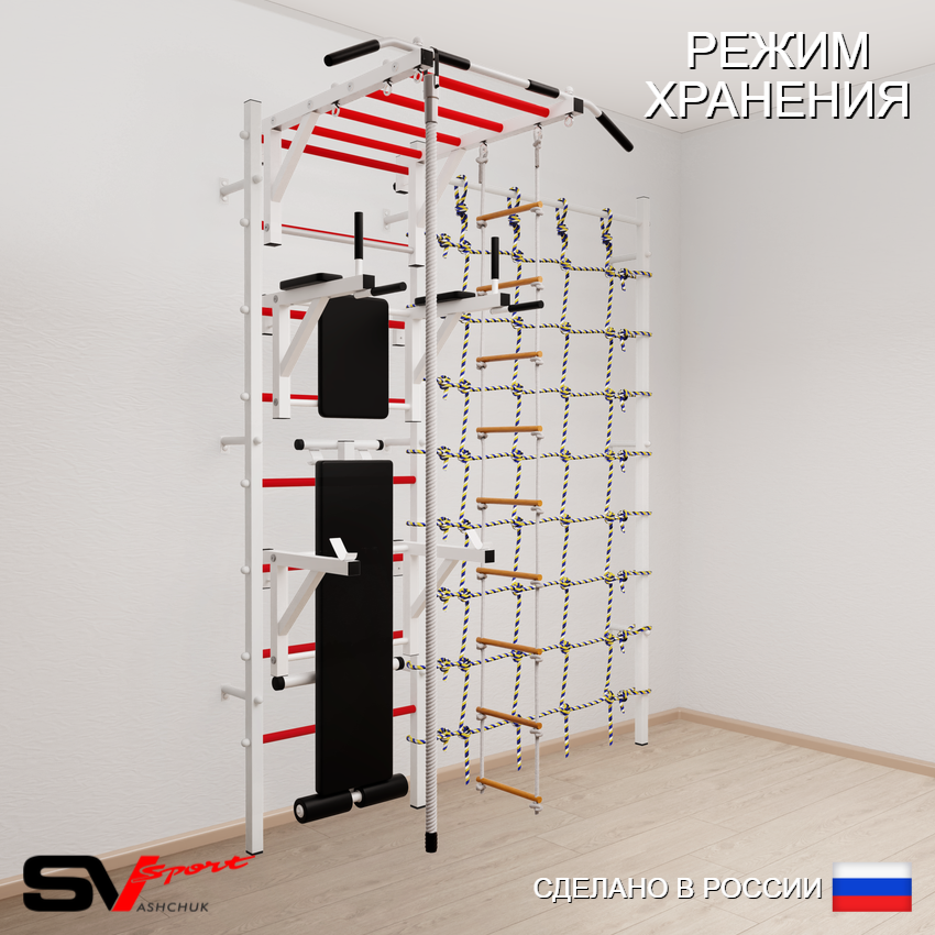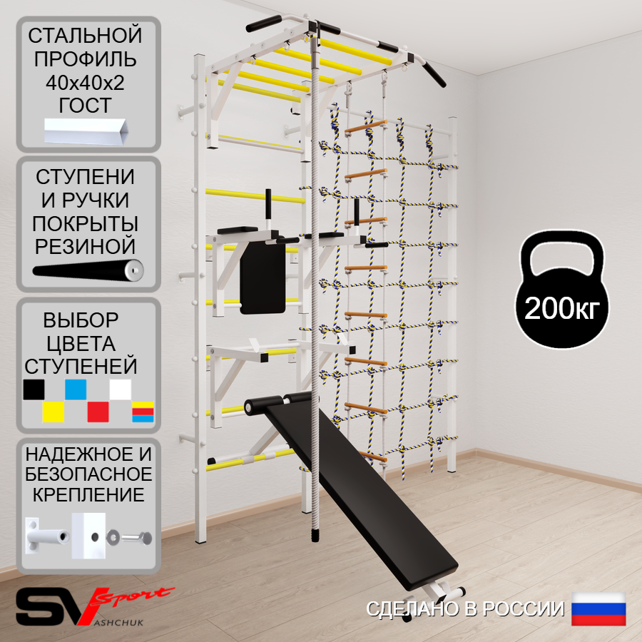 КОМПЛЕКТАЦИЯ: Шведская стенка Sv Sport (профиль вертикальных стоек 40 х 40 х 2 мм), Турник Sv Sport рукоход к ШС, Брусья Sv Sport к ШС, Стойка под штангу Sv Sport к ШС, Скамья для пресса и жима Sv Sport к ШС, Kанат, Лестница веревочная, Канатный лаз.