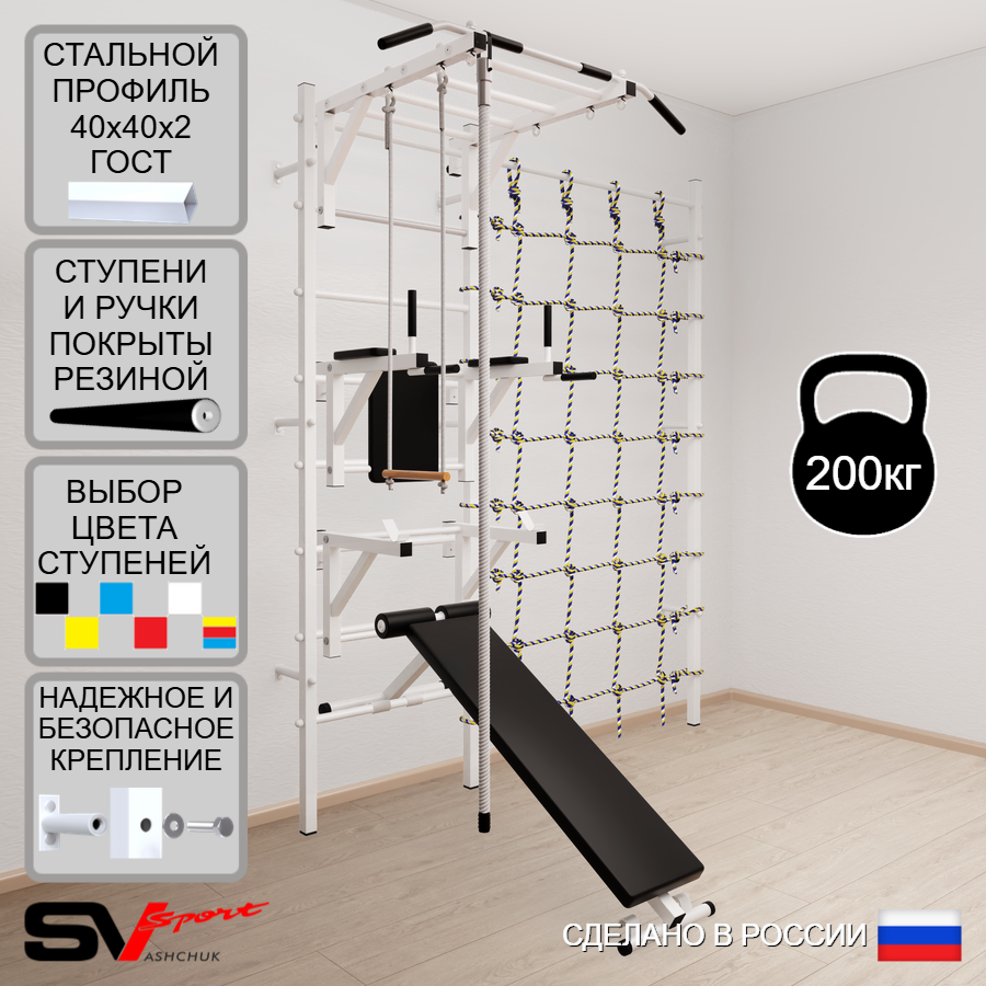 КОМПЛЕКТАЦИЯ: Шведская стенка Sv Sport (профиль вертикальных стоек 40 х 40 х 2 мм), Турник Sv Sport рукоход к ШС, Брусья Sv Sport к ШС, Стойка под штангу Sv Sport к ШС, Скамья для пресса и жима Sv Sport к ШС, Kанат, Трапеция, Канатный лаз.