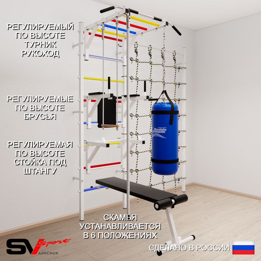 КОМПЛЕКТАЦИЯ: Шведская стенка Sv Sport (профиль вертикальных стоек 40 х 40 х 2 мм), Турник Sv Sport рукоход к ШС, Брусья Sv Sport к ШС, Стойка под штангу Sv Sport к ШС, Скамья для пресса и жима Sv Sport к ШС, Kанат, Трапеция, Цепь удлинитель 90см, Мешок боксерский 15кг, Канатный лаз.