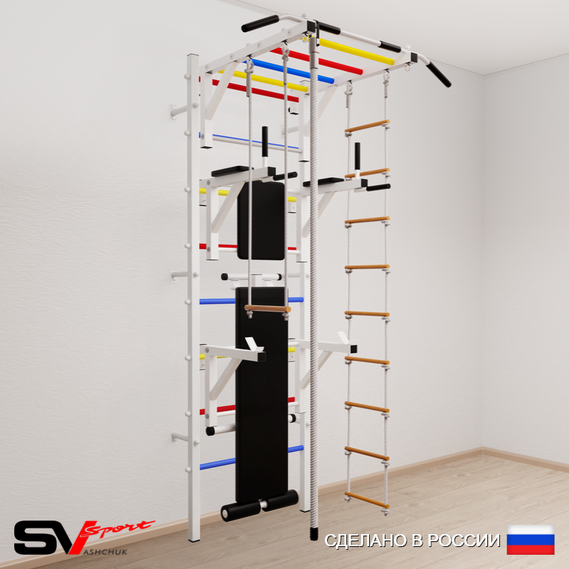 КОМПЛЕКТАЦИЯ: Шведская стенка Sv Sport (профиль вертикальных стоек 40 х 40 х 2 мм), Турник Sv Sport рукоход к ШС, Брусья Sv Sport к ШС, Стойка под штангу Sv Sport к ШС, Скамья для пресса и жима Sv Sport к ШС, Kанат, Трапеция, Лестница веревочная.