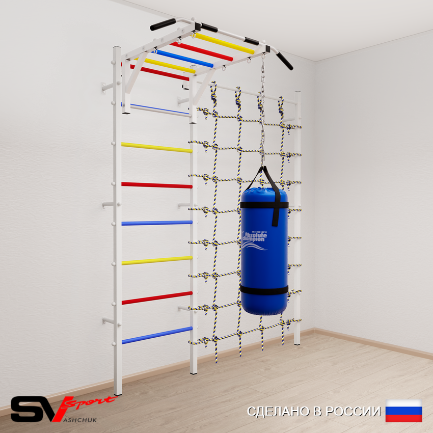 КОМПЛЕКТАЦИЯ: Шведская стенка Sv Sport усиленная (профиль вертикальных стоек 60 х 40 х 2 мм), Турник Sv Sport рукоход к ШС, Цепь удлинитель 90см, Мешок боксерский 22кг, Канатный лаз.