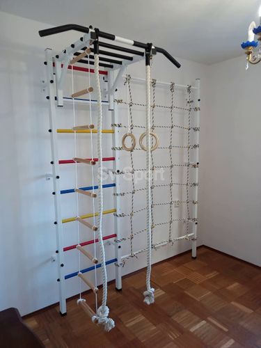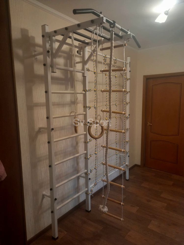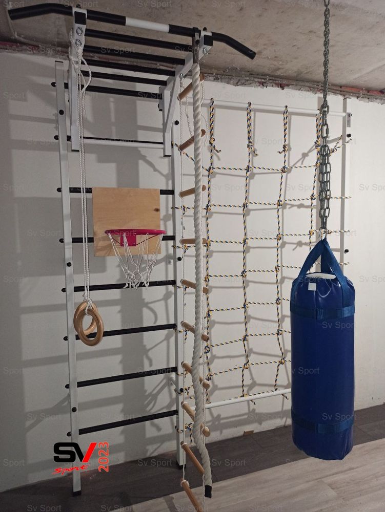 КОМПЛЕКТАЦИЯ: Шведская стенка Sv Sport усиленная (профиль вертикальных стоек 60 х 40 х 2 мм), Турник Sv Sport рукоход к ШС, Kанат, Kольца деревянные, Лестница веревочная, Канатный лаз.