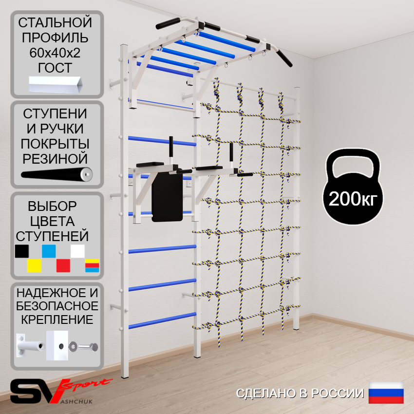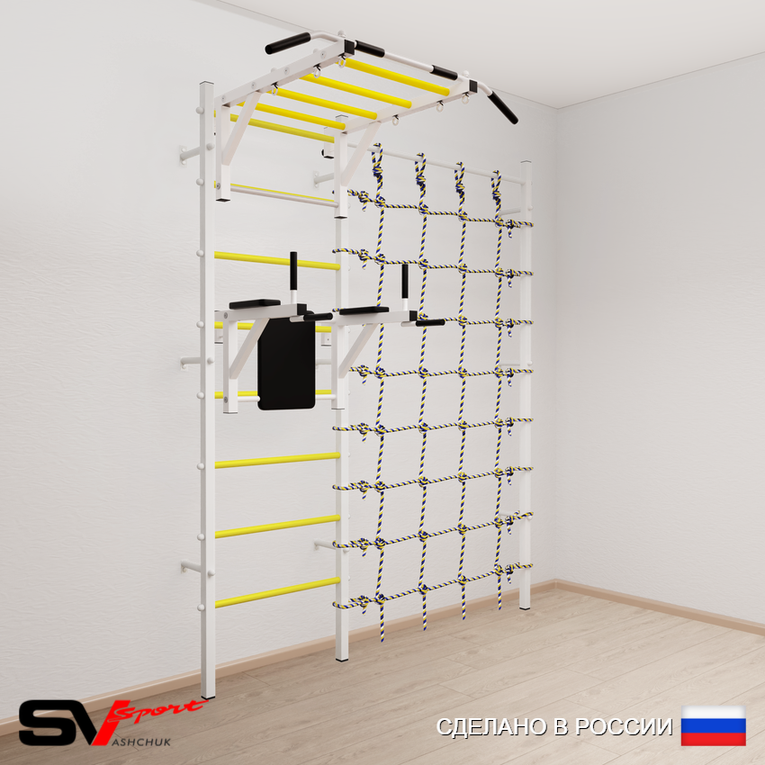 КОМПЛЕКТАЦИЯ: Шведская стенка Sv Sport усиленная (профиль вертикальных стоек 60 х 40 х 2 мм), Турник Sv Sport рукоход к ШС, Брусья Sv Sport к ШС, Канатный лаз.