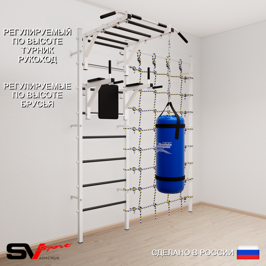 КОМПЛЕКТАЦИЯ: Шведская стенка Sv Sport усиленная (профиль вертикальных стоек 60 х 40 х 2 мм), Турник Sv Sport рукоход к ШС, Брусья Sv Sport к ШС, Цепь удлинитель 90см, Мешок боксерский 15кг, Канатный лаз.