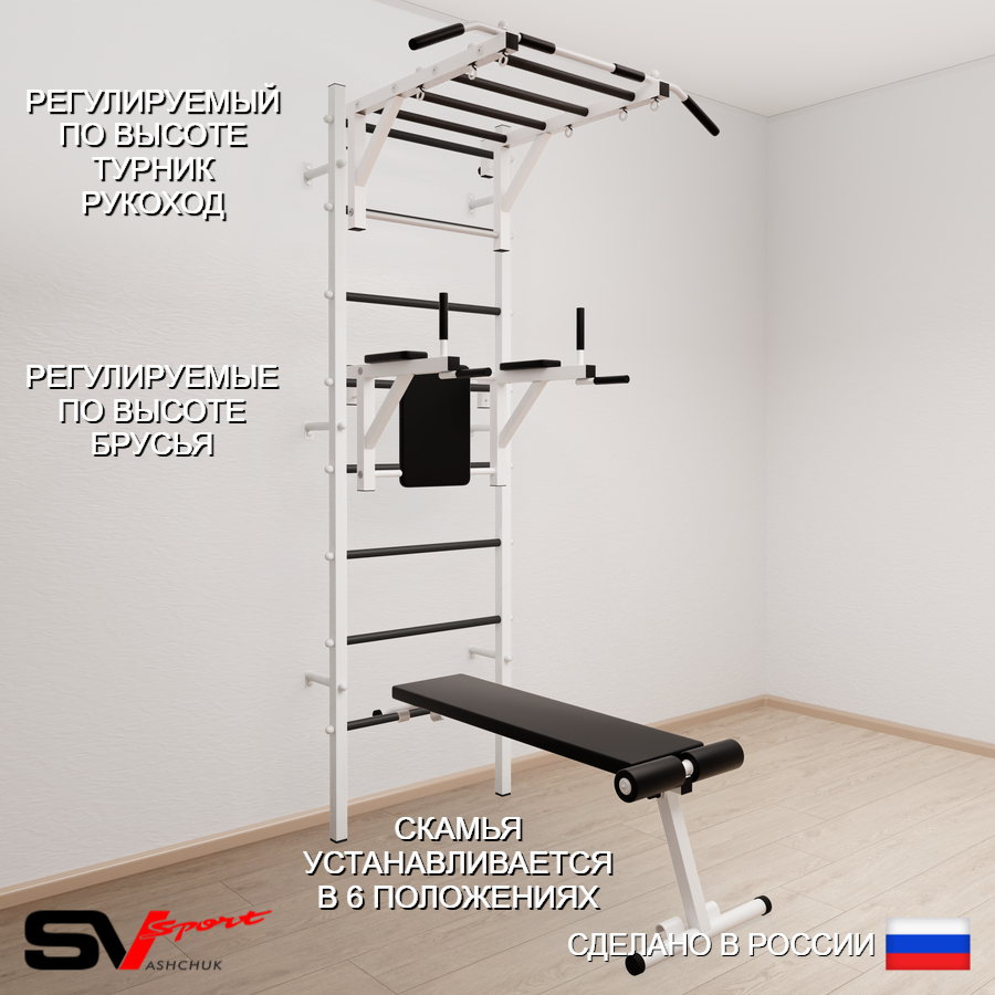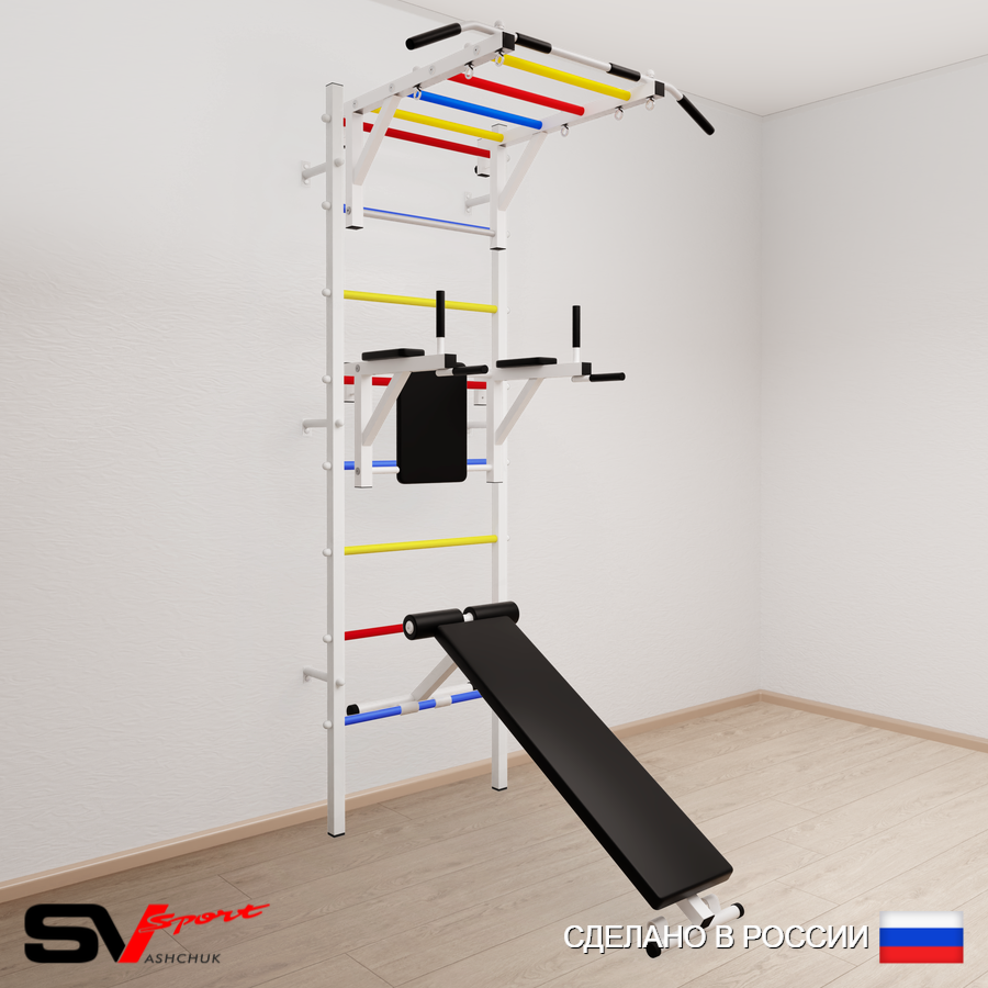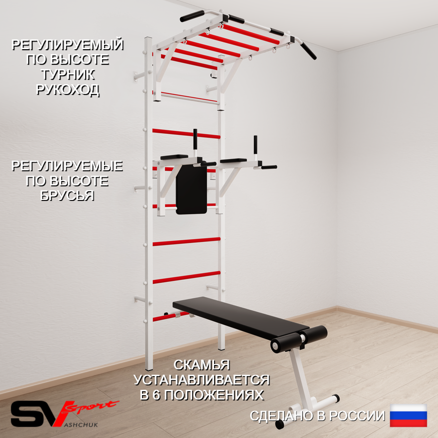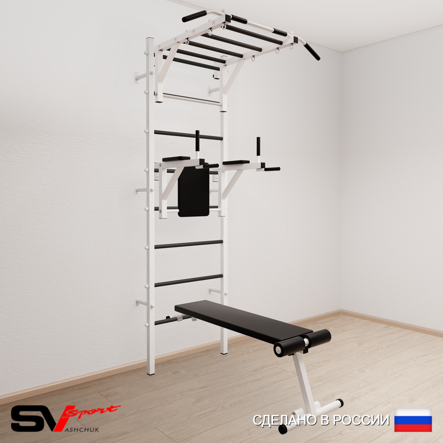 КОМПЛЕКТАЦИЯ: Шведская стенка Sv Sport усиленная (профиль вертикальных стоек 60 х 40 х 2 мм), Турник Sv Sport рукоход к ШС, Брусья Sv Sport к ШС, Скамья для пресса и жима Sv Sport к ШС.