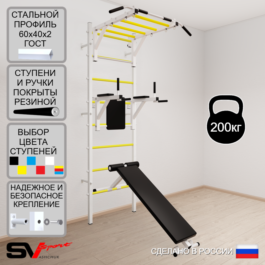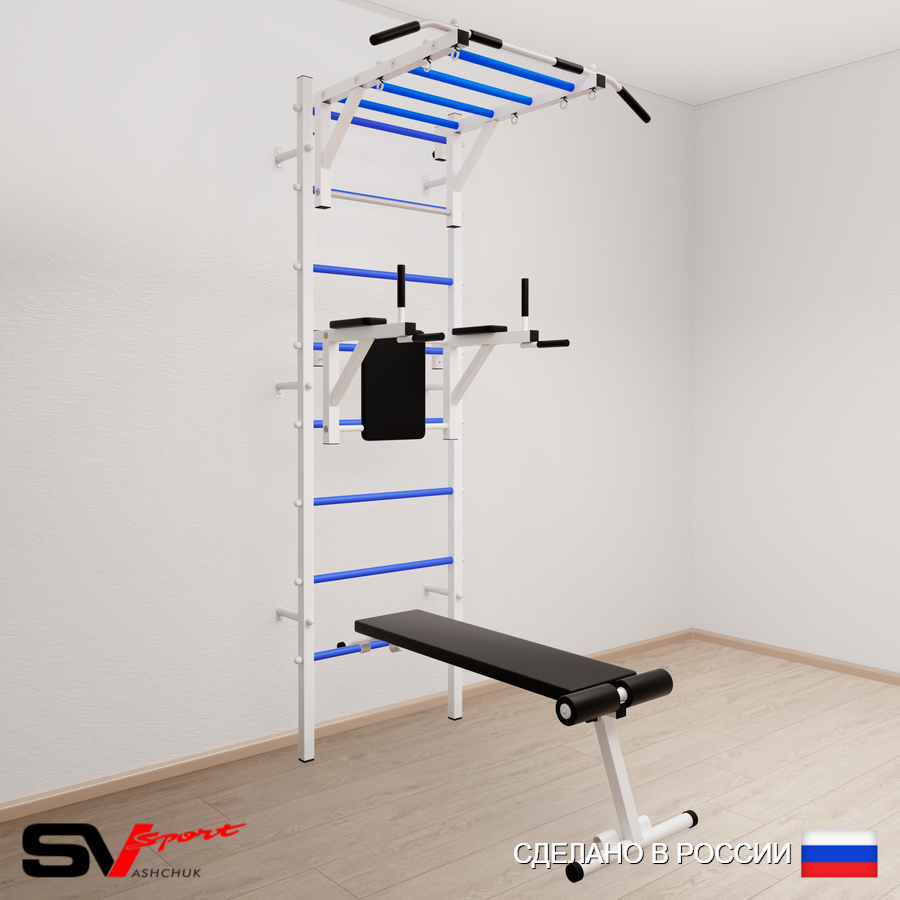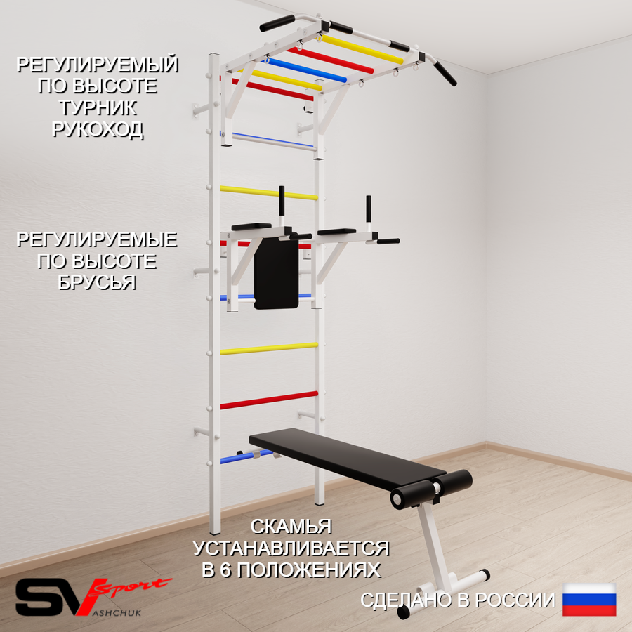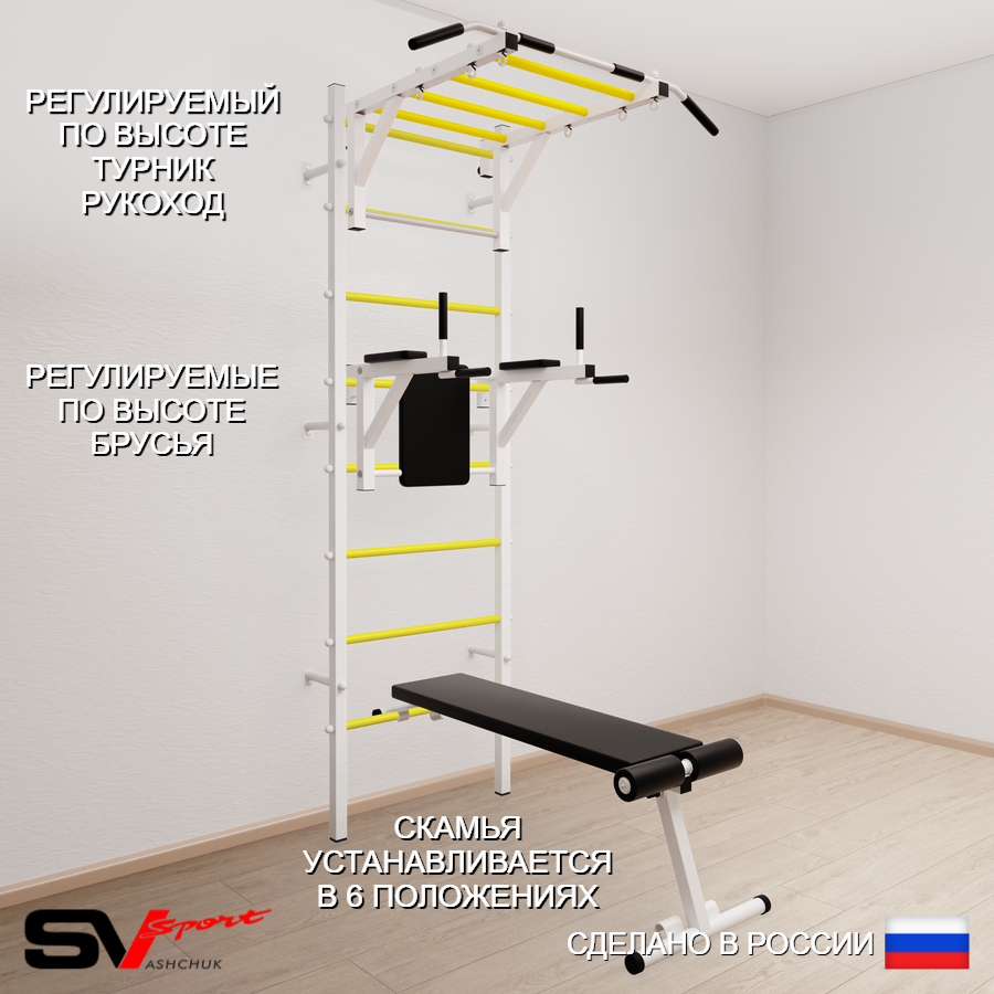 КОМПЛЕКТАЦИЯ: Шведская стенка Sv Sport усиленная (профиль вертикальных стоек 60 х 40 х 2 мм), Турник Sv Sport рукоход к ШС, Брусья Sv Sport к ШС, Скамья для пресса и жима Sv Sport к ШС.