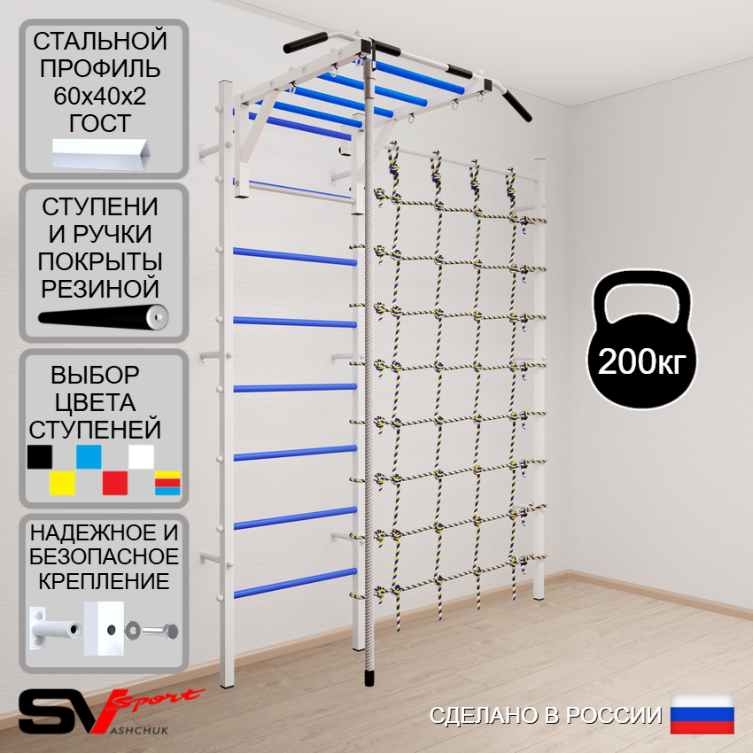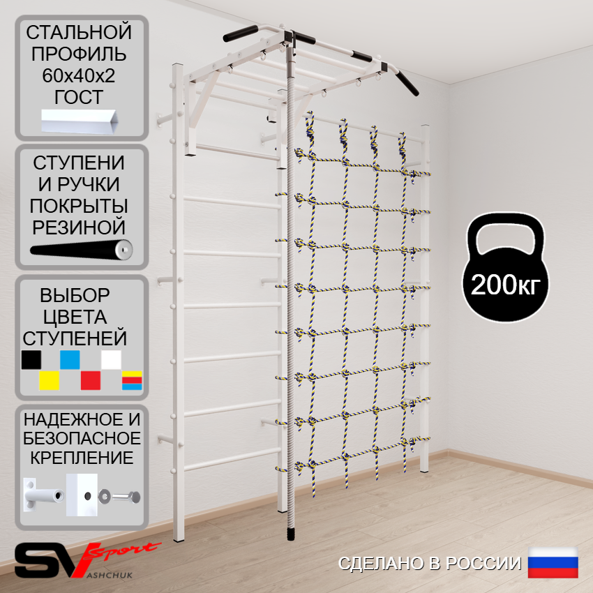 КОМПЛЕКТАЦИЯ: Шведская стенка Sv Sport усиленная (профиль вертикальных стоек 60 х 40 х 2 мм), Турник Sv Sport рукоход к ШС, Kанат, Канатный лаз.