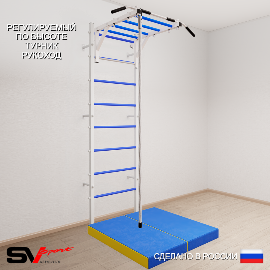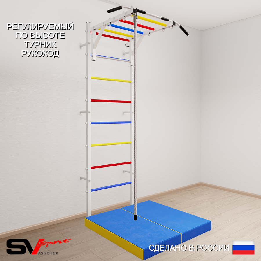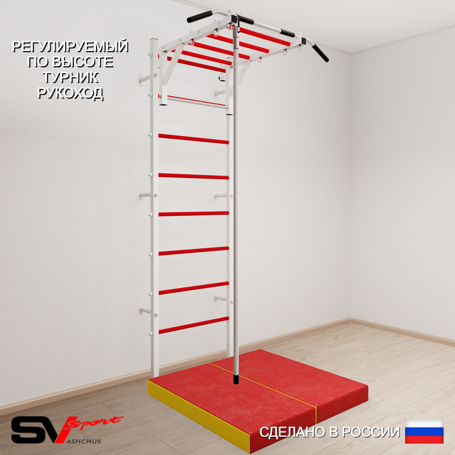 КОМПЛЕКТАЦИЯ: Шведская стенка Sv Sport усиленная (профиль вертикальных стоек 60 х 40 х 2 мм), Турник Sv Sport рукоход к ШС, Kанат, Спортивный мат 100 х 100 х 10 см складной.
