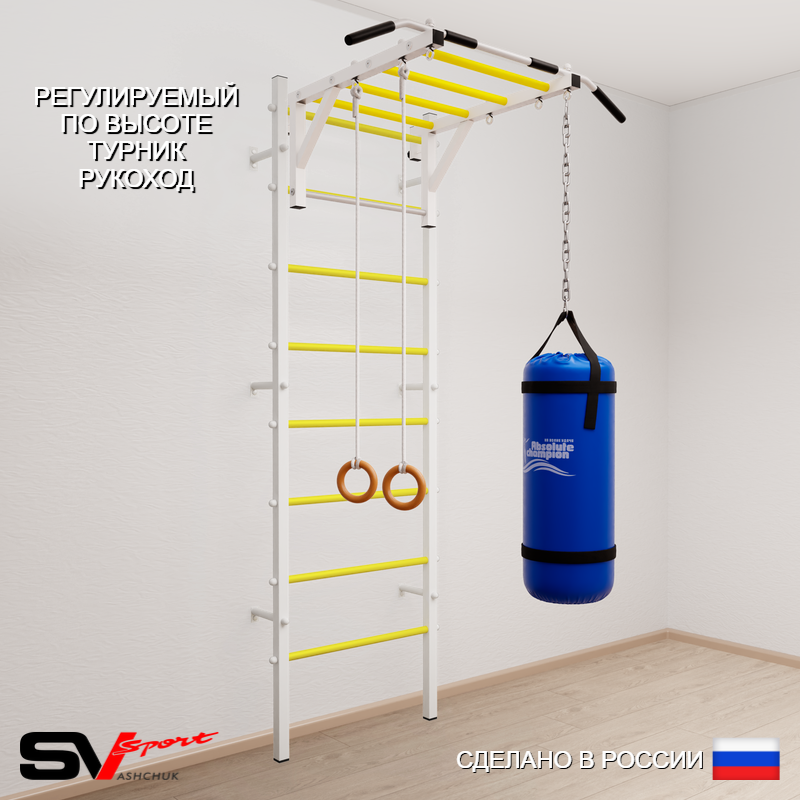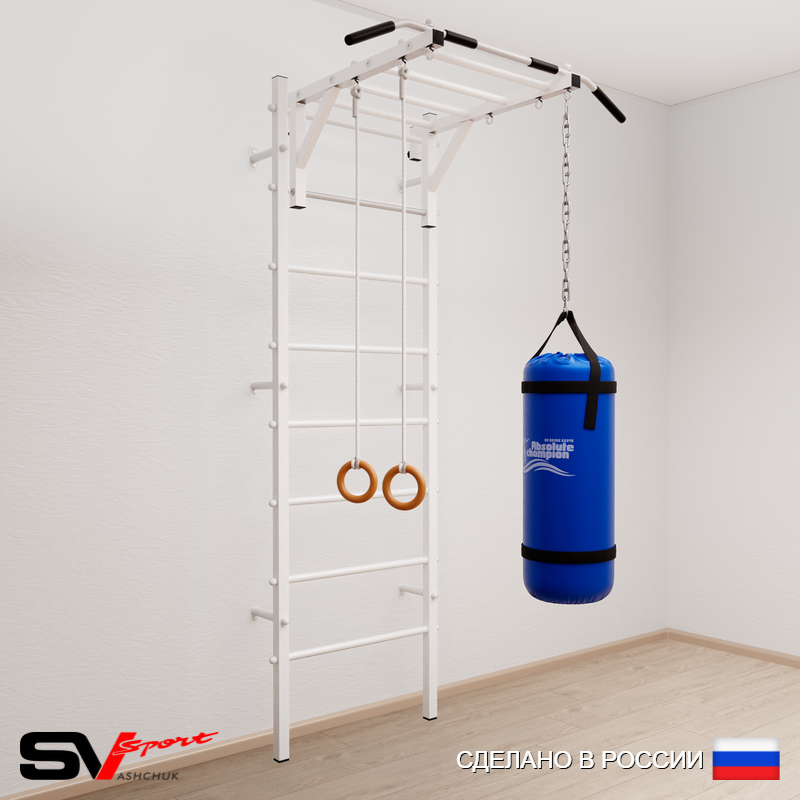КОМПЛЕКТАЦИЯ: Шведская стенка Sv Sport усиленная (профиль вертикальных стоек 60 х 40 х 2 мм), Турник Sv Sport рукоход к ШС, Kольца деревянные, Цепь удлинитель 90см, Мешок боксерский 22кг.