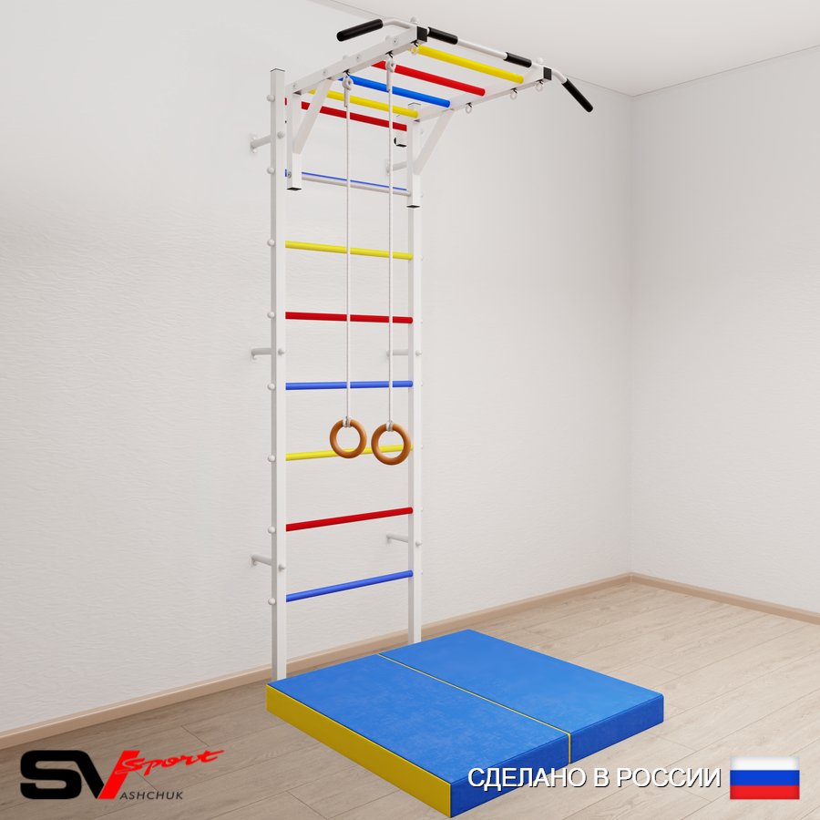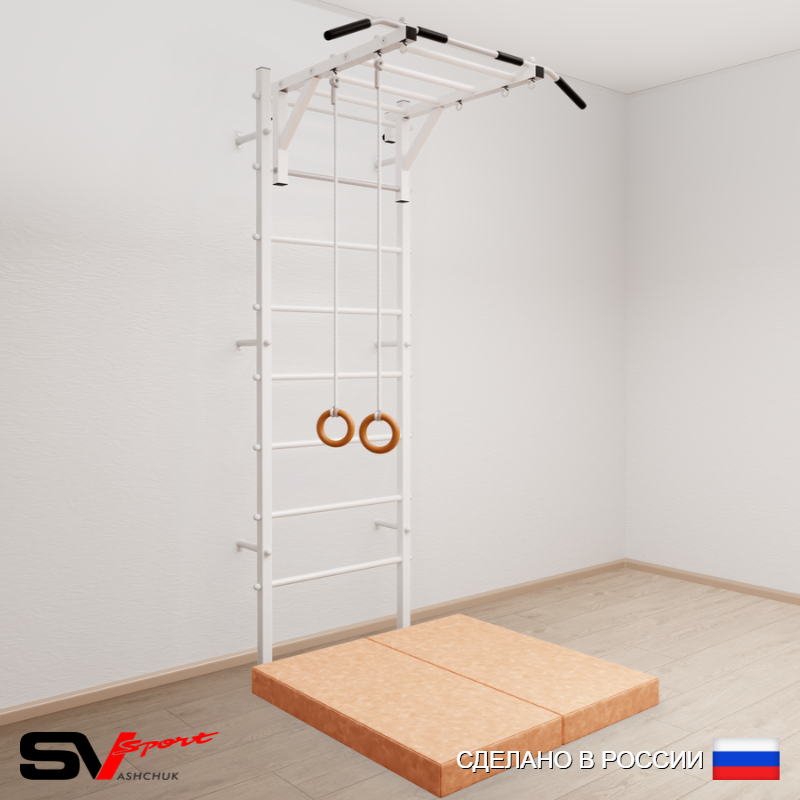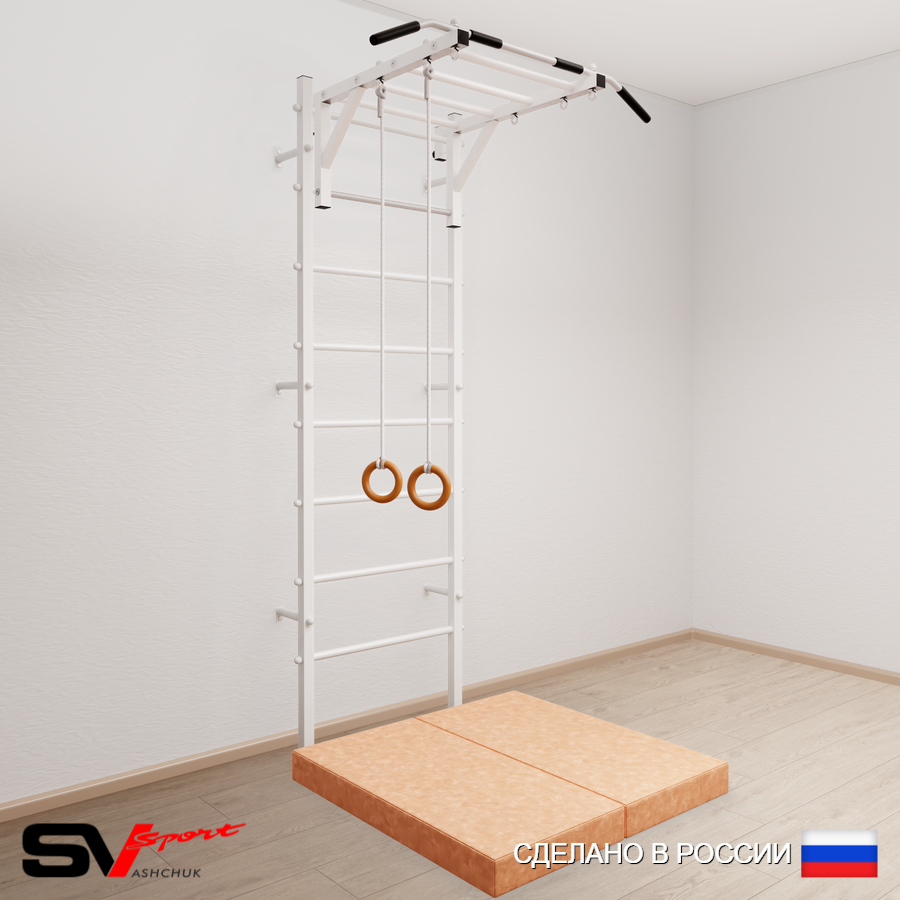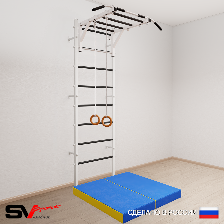 КОМПЛЕКТАЦИЯ: Шведская стенка Sv Sport усиленная (профиль вертикальных стоек 60 х 40 х 2 мм), Турник Sv Sport рукоход к ШС, Kольца деревянные, Спортивный мат 100 х 100 х 10 см складной.