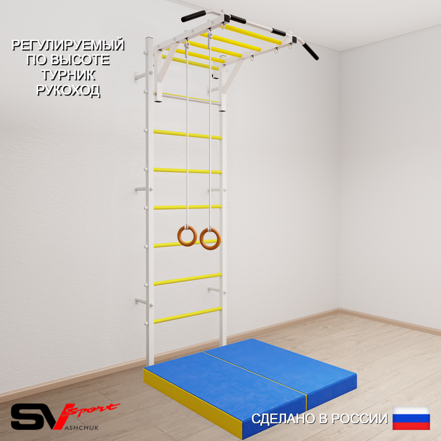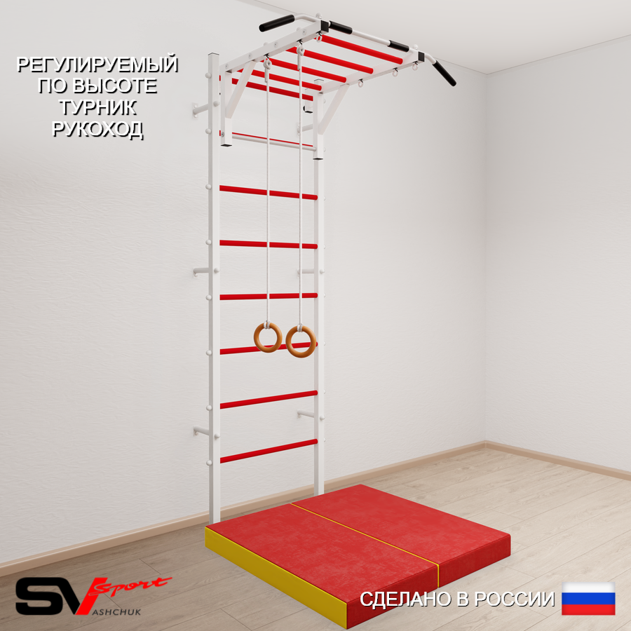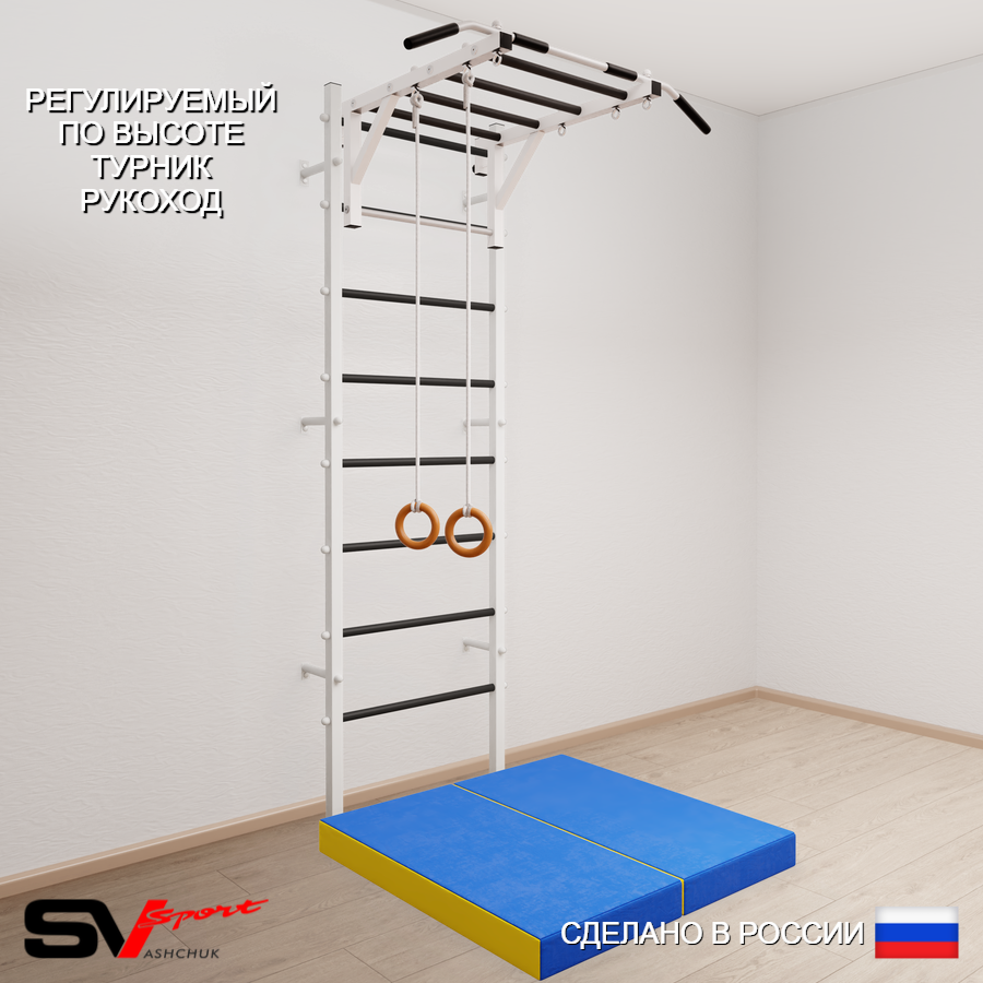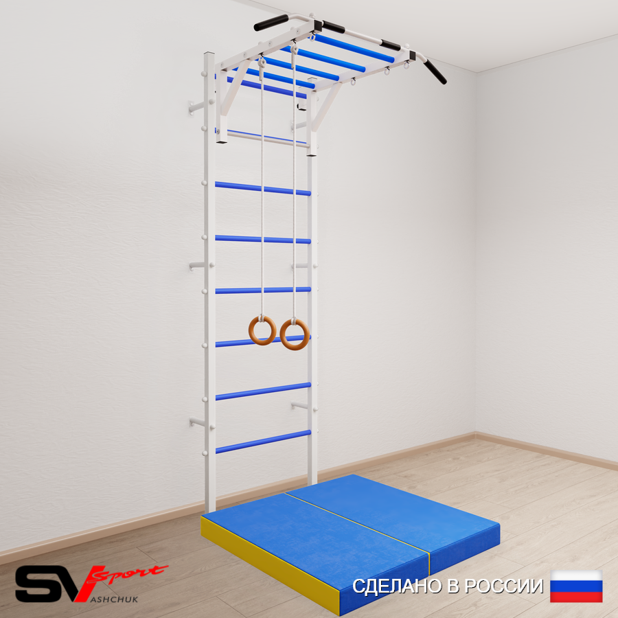КОМПЛЕКТАЦИЯ: Шведская стенка Sv Sport усиленная (профиль вертикальных стоек 60 х 40 х 2 мм), Турник Sv Sport рукоход к ШС, Kольца деревянные, Спортивный мат 100 х 100 х 10 см складной.