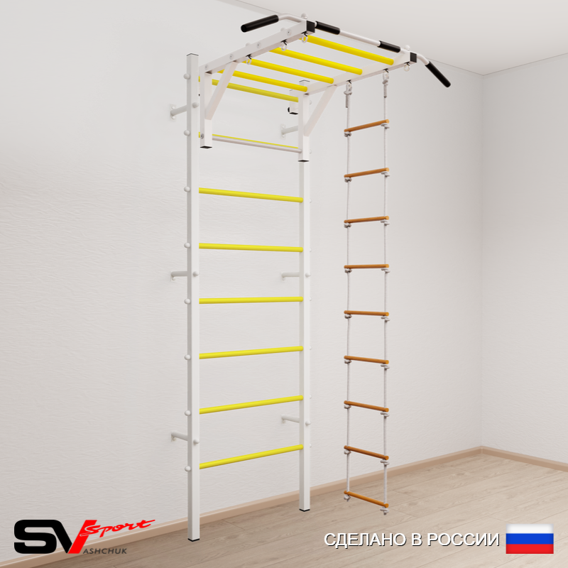 КОМПЛЕКТАЦИЯ: Шведская стенка Sv Sport усиленная (профиль вертикальных стоек 60 х 40 х 2 мм), Турник Sv Sport рукоход к ШС, Лестница веревочная.