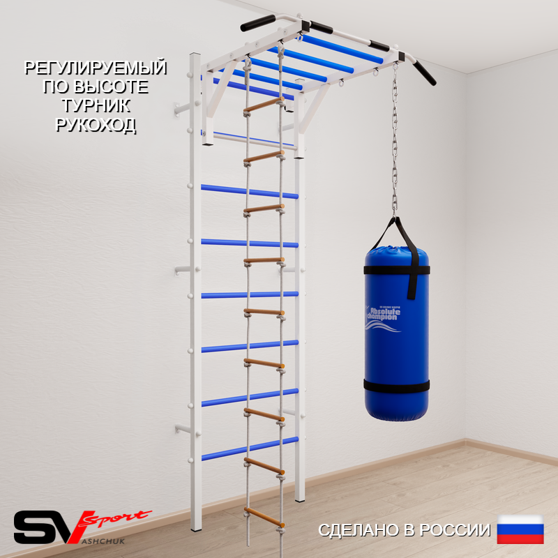 КОМПЛЕКТАЦИЯ: Шведская стенка Sv Sport усиленная (профиль вертикальных стоек 60 х 40 х 2 мм), Турник Sv Sport рукоход к ШС, Лестница веревочная, Цепь удлинитель 90см, Мешок боксерский 30кг.
