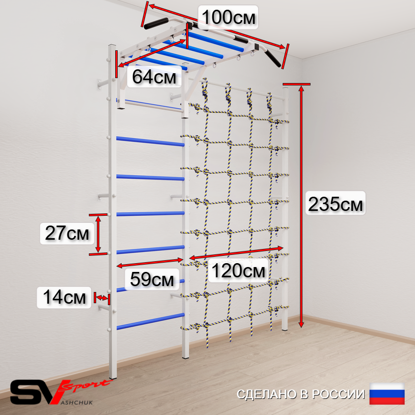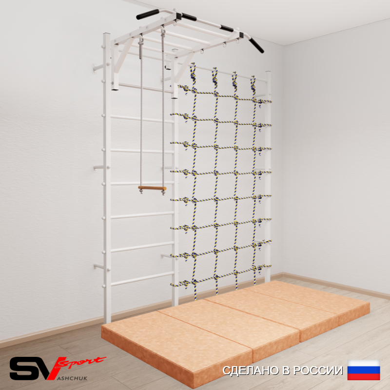 КОМПЛЕКТАЦИЯ: Шведская стенка Sv Sport усиленная (профиль вертикальных стоек 60 х 40 х 2 мм), Турник Sv Sport рукоход к ШС, Трапеция, Спортивный мат 100 х 200 х 10 см складной, Канатный лаз.
