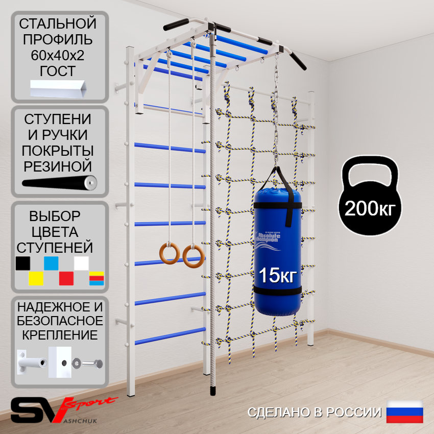 КОМПЛЕКТАЦИЯ: Шведская стенка Sv Sport усиленная (профиль вертикальных стоек 60 х 40 х 2 мм), Турник Sv Sport рукоход к ШС, Kанат, Kольца деревянные, Цепь удлинитель 90см, Мешок боксерский 15кг, Канатный лаз.