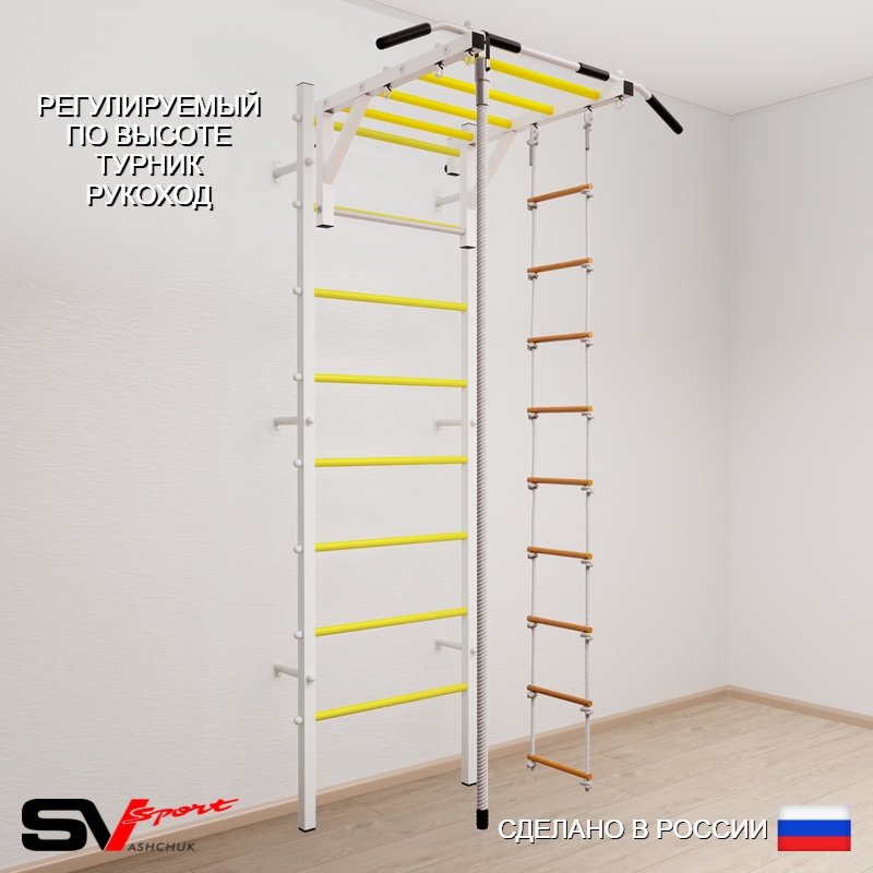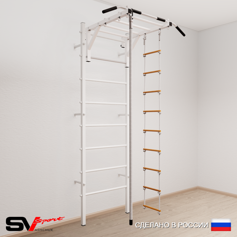 КОМПЛЕКТАЦИЯ: Шведская стенка Sv Sport усиленная (профиль вертикальных стоек 60 х 40 х 2 мм), Турник Sv Sport рукоход к ШС, Kанат, Лестница веревочная.