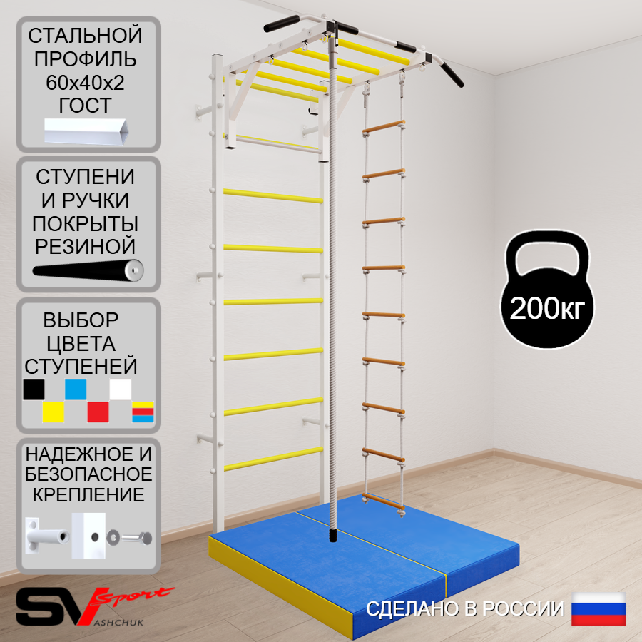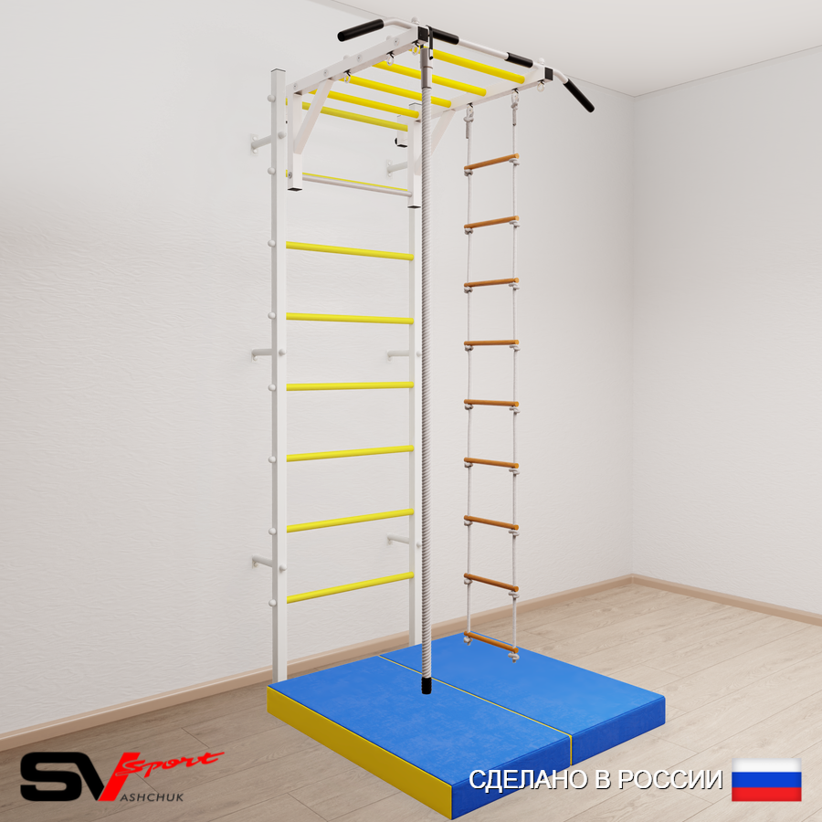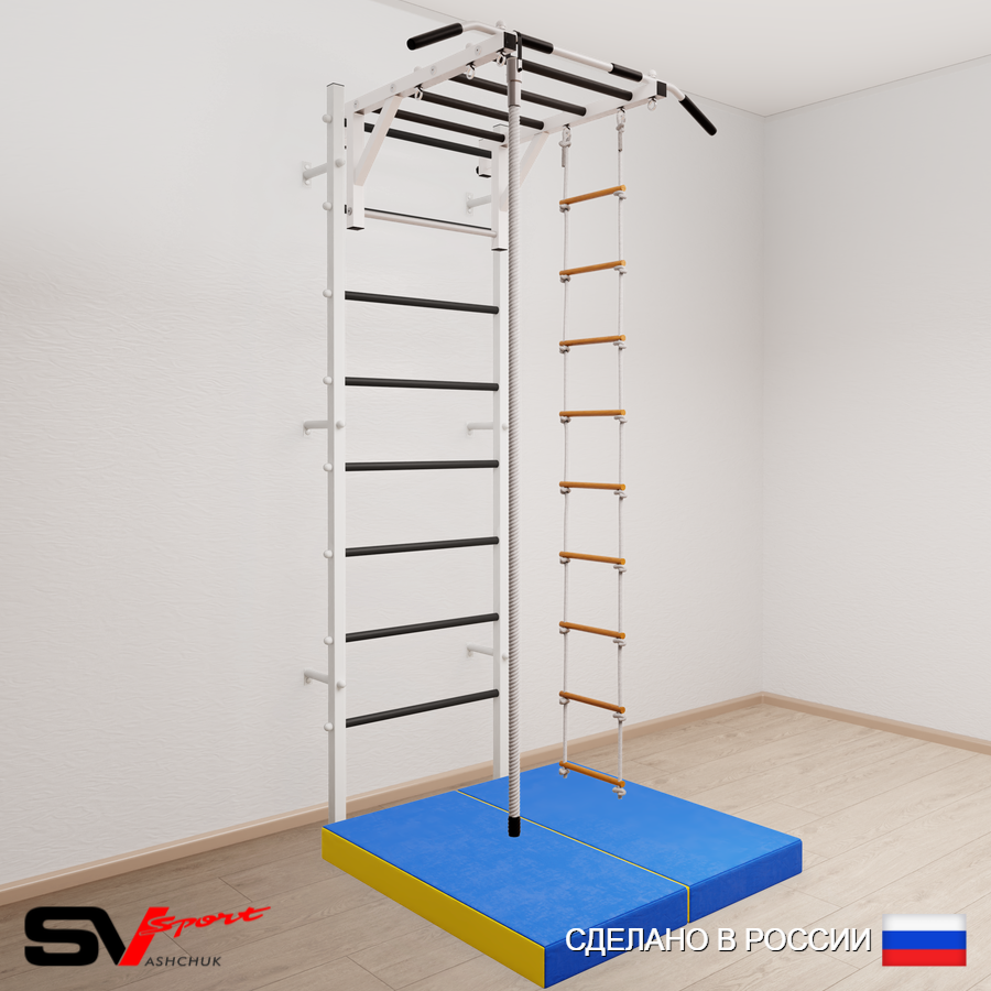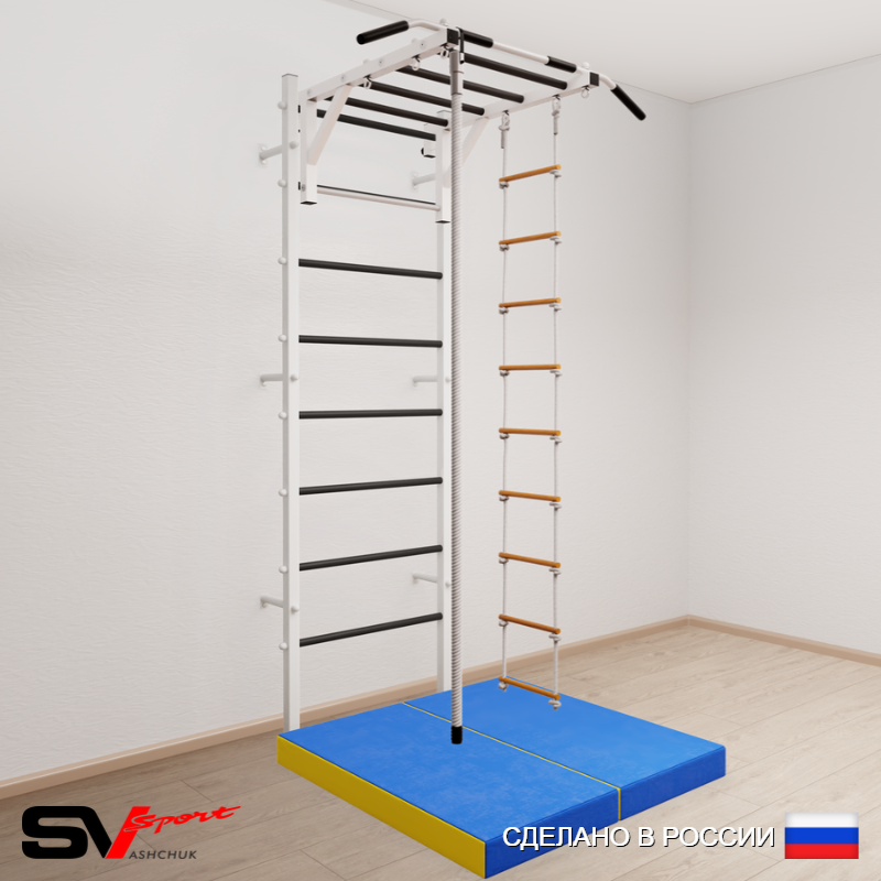 КОМПЛЕКТАЦИЯ: Шведская стенка Sv Sport усиленная (профиль вертикальных стоек 60 х 40 х 2 мм), Турник Sv Sport рукоход к ШС, Kанат, Лестница веревочная, Спортивный мат 100 х 100 х 10 см складной.