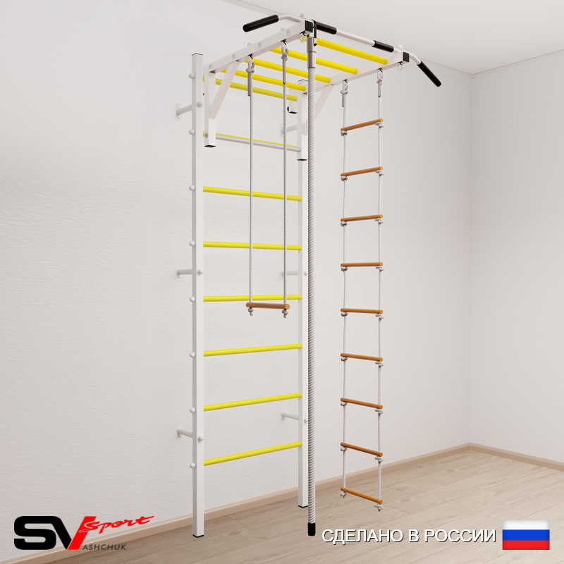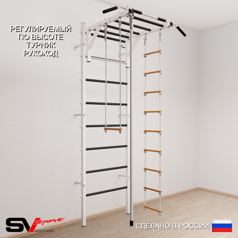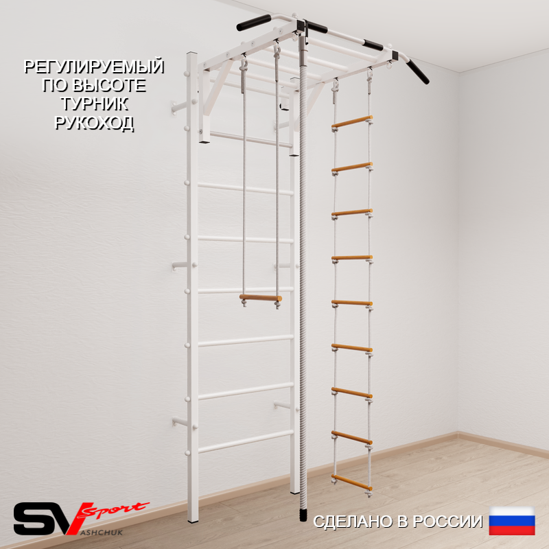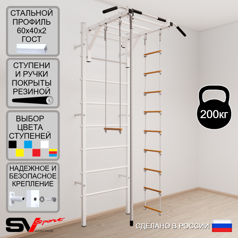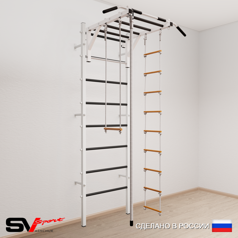 КОМПЛЕКТАЦИЯ: Шведская стенка Sv Sport усиленная (профиль вертикальных стоек 60 х 40 х 2 мм), Турник Sv Sport рукоход к ШС, Kанат, Трапеция, Лестница веревочная.