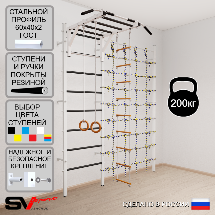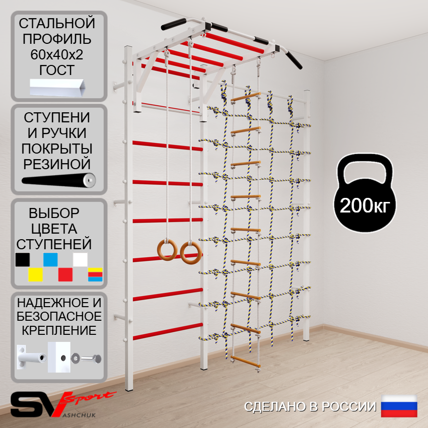 КОМПЛЕКТАЦИЯ: Шведская стенка Sv Sport усиленная (профиль вертикальных стоек 60 х 40 х 2 мм), Турник Sv Sport рукоход к ШС, Kольца деревянные, Лестница веревочная, Канатный лаз.