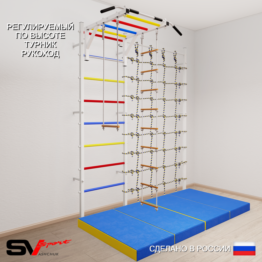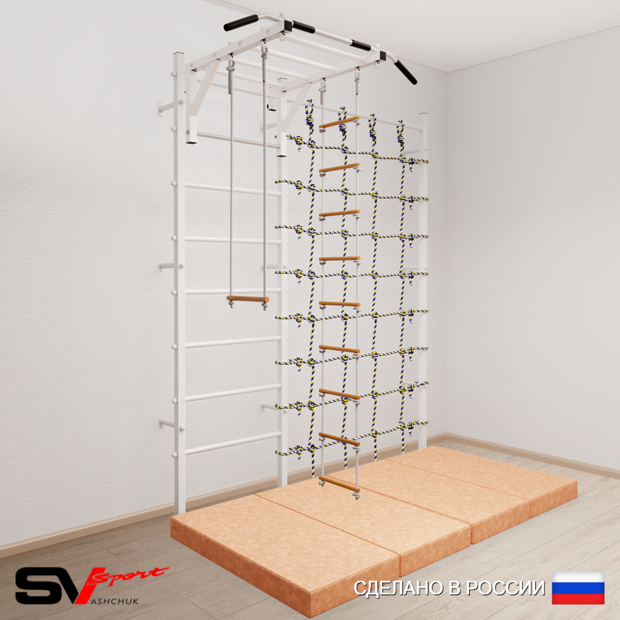 КОМПЛЕКТАЦИЯ: Шведская стенка Sv Sport усиленная (профиль вертикальных стоек 60 х 40 х 2 мм), Турник Sv Sport рукоход к ШС, Трапеция, Лестница веревочная, Спортивный мат 100 х 200 х 10 см складной, Канатный лаз.