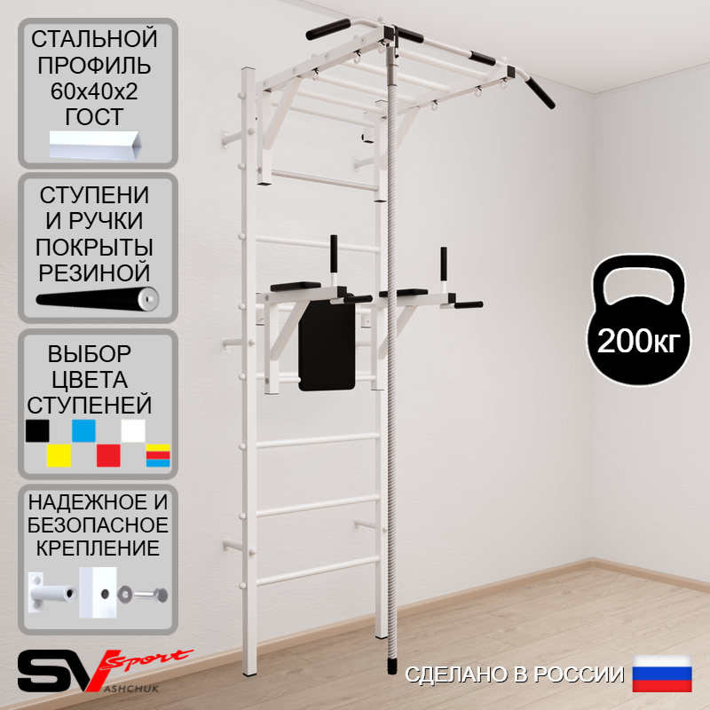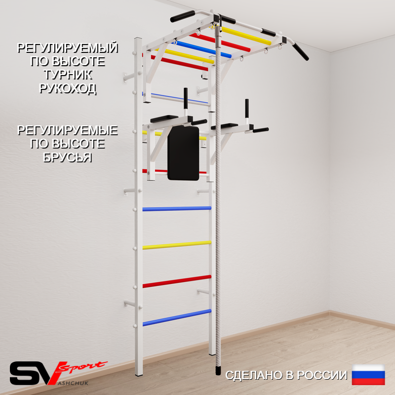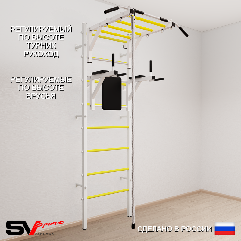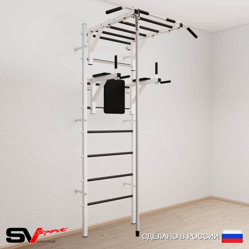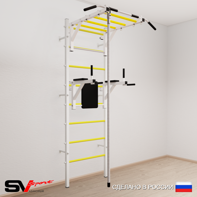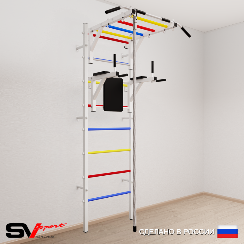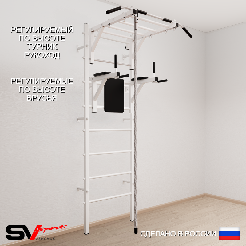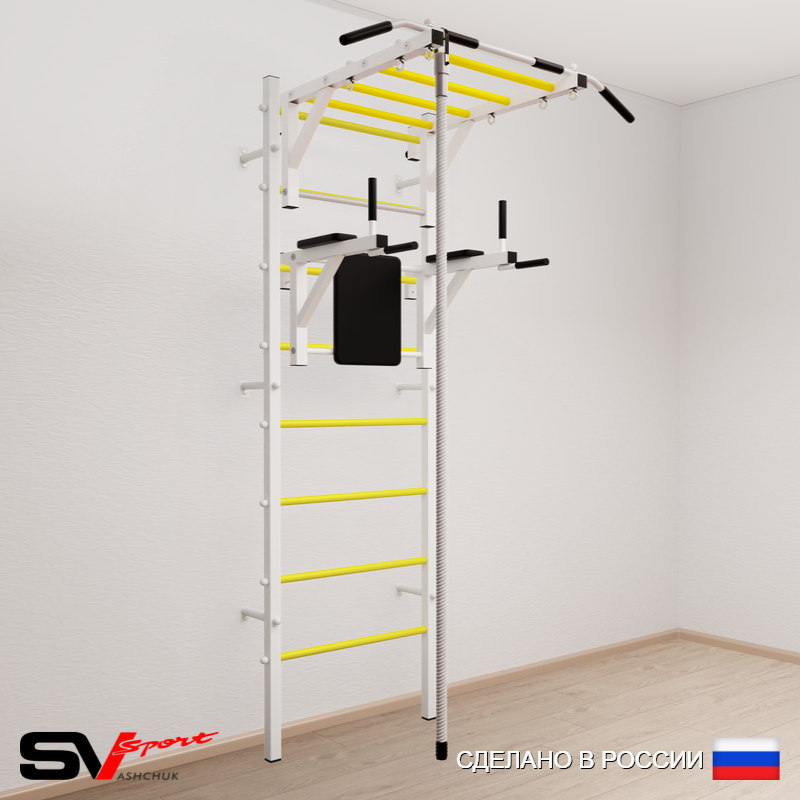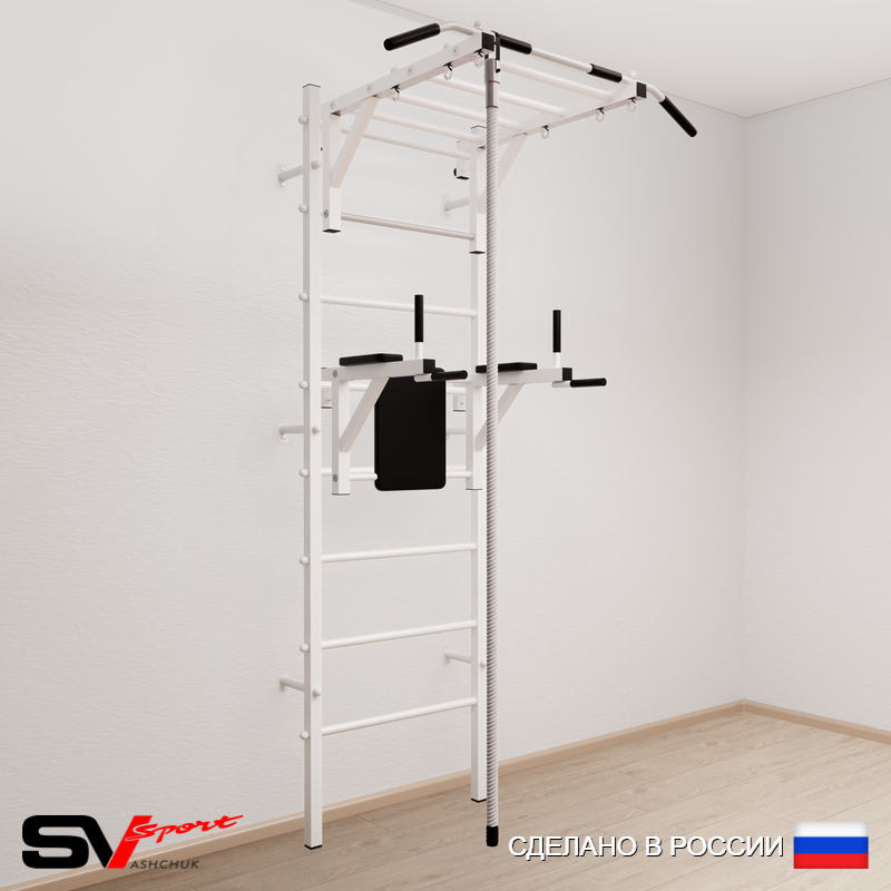 КОМПЛЕКТАЦИЯ: Шведская стенка Sv Sport усиленная (профиль вертикальных стоек 60 х 40 х 2 мм), Турник Sv Sport рукоход к ШС, Брусья Sv Sport к ШС, Kанат.