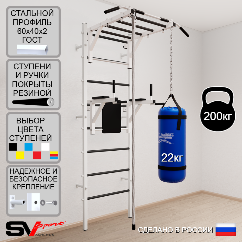 КОМПЛЕКТАЦИЯ: Шведская стенка Sv Sport усиленная (профиль вертикальных стоек 60 х 40 х 2 мм), Турник Sv Sport рукоход к ШС, Брусья Sv Sport к ШС, Kанат, Цепь удлинитель 90см, Мешок боксерский 22кг.
