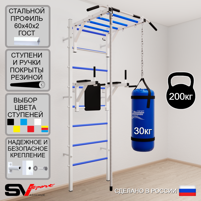 КОМПЛЕКТАЦИЯ: Шведская стенка Sv Sport усиленная (профиль вертикальных стоек 60 х 40 х 2 мм), Турник Sv Sport рукоход к ШС, Брусья Sv Sport к ШС, Kанат, Цепь удлинитель 90см, Мешок боксерский 30кг.