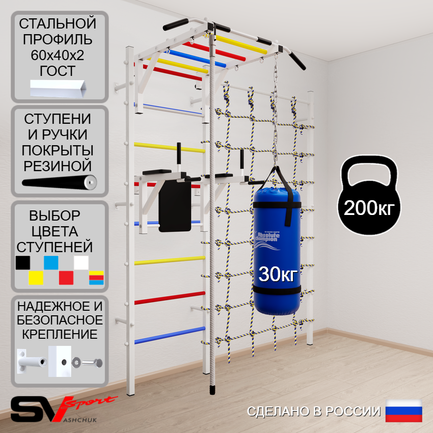 КОМПЛЕКТАЦИЯ: Шведская стенка Sv Sport усиленная (профиль вертикальных стоек 60 х 40 х 2 мм), Турник Sv Sport рукоход к ШС, Брусья Sv Sport к ШС, Kанат, Цепь удлинитель 90см, Мешок боксерский 30кг, Канатный лаз.