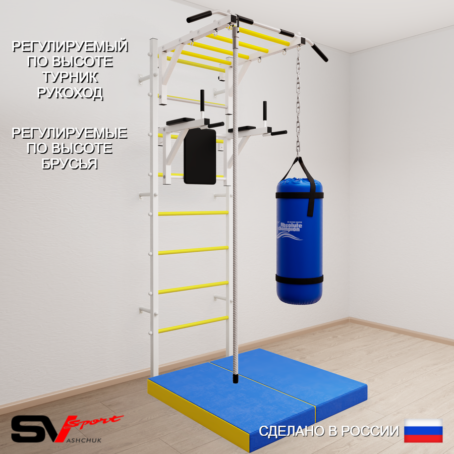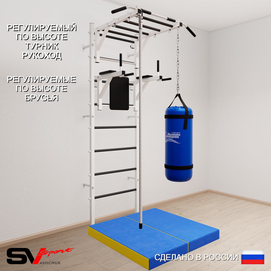 КОМПЛЕКТАЦИЯ: Шведская стенка Sv Sport усиленная (профиль вертикальных стоек 60 х 40 х 2 мм), Турник Sv Sport рукоход к ШС, Брусья Sv Sport к ШС, Kанат, Цепь удлинитель 90см, Мешок боксерский 30кг, Спортивный мат 100 х 100 х 10 см складной.