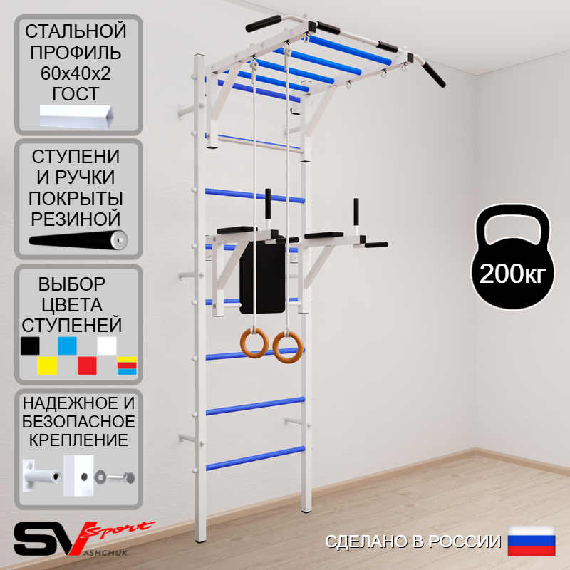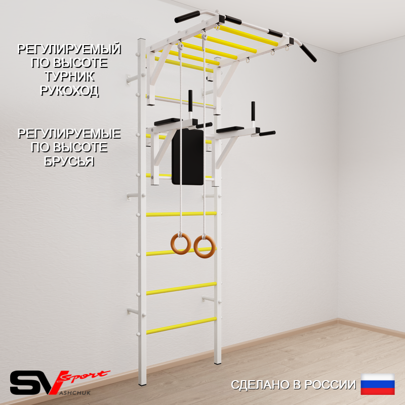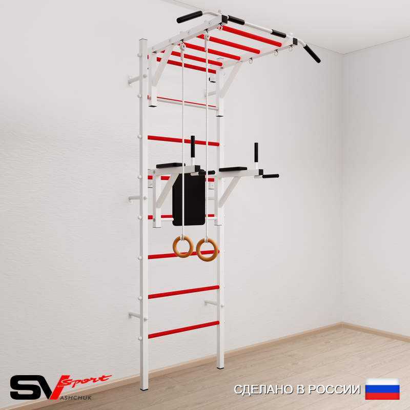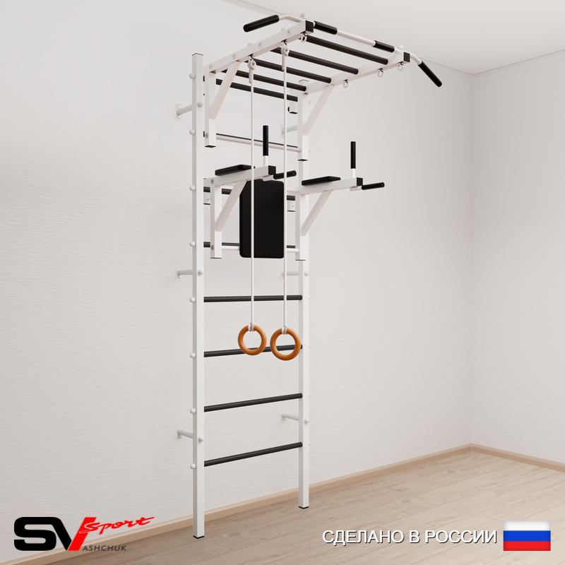 КОМПЛЕКТАЦИЯ: Шведская стенка Sv Sport усиленная (профиль вертикальных стоек 60 х 40 х 2 мм), Турник Sv Sport рукоход к ШС, Брусья Sv Sport к ШС, Kольца деревянные.