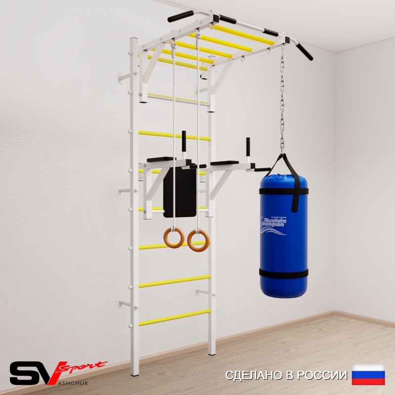 КОМПЛЕКТАЦИЯ: Шведская стенка Sv Sport усиленная (профиль вертикальных стоек 60 х 40 х 2 мм), Турник Sv Sport рукоход к ШС, Брусья Sv Sport к ШС, Kольца деревянные, Цепь удлинитель 90см, Мешок боксерский 15кг.