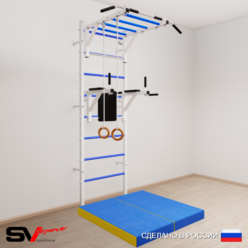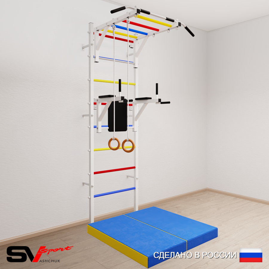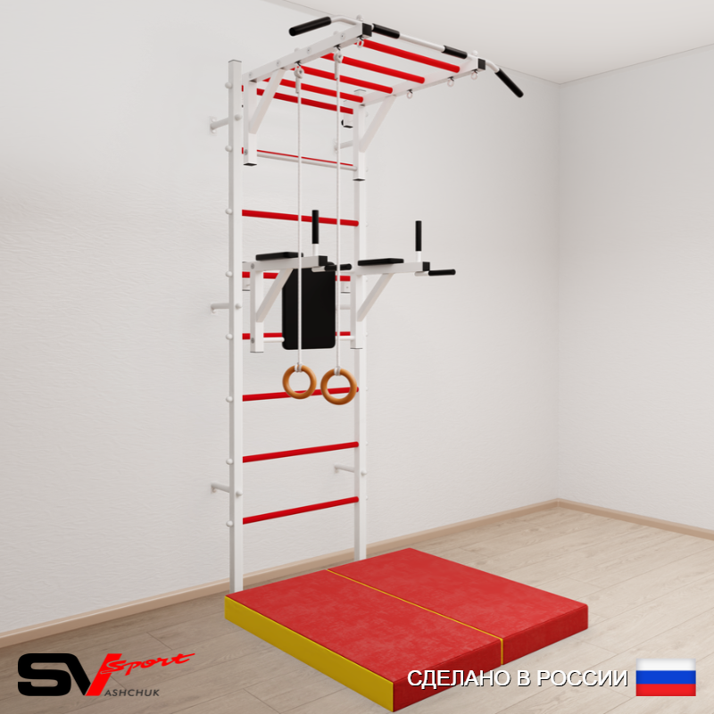 КОМПЛЕКТАЦИЯ: Шведская стенка Sv Sport усиленная (профиль вертикальных стоек 60 х 40 х 2 мм), Турник Sv Sport рукоход к ШС, Брусья Sv Sport к ШС, Kольца деревянные, Спортивный мат 100 х 100 х 10 см складной.