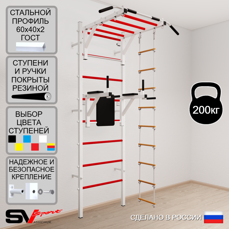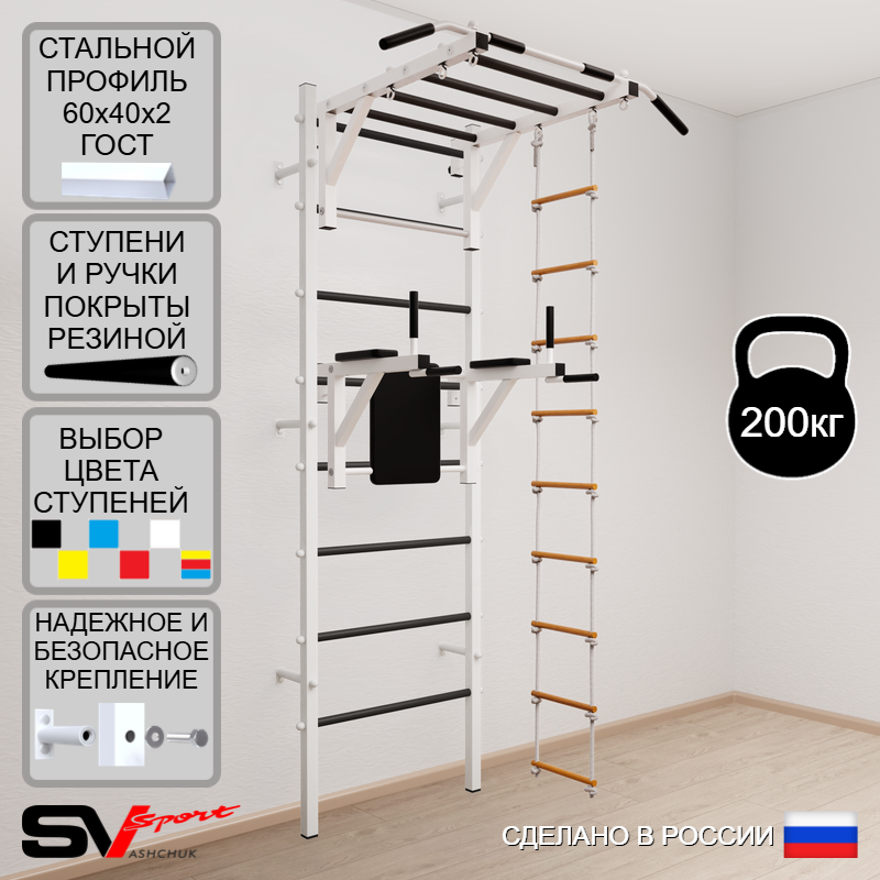 КОМПЛЕКТАЦИЯ: Шведская стенка Sv Sport усиленная (профиль вертикальных стоек 60 х 40 х 2 мм), Турник Sv Sport рукоход к ШС, Брусья Sv Sport к ШС, Лестница веревочная.