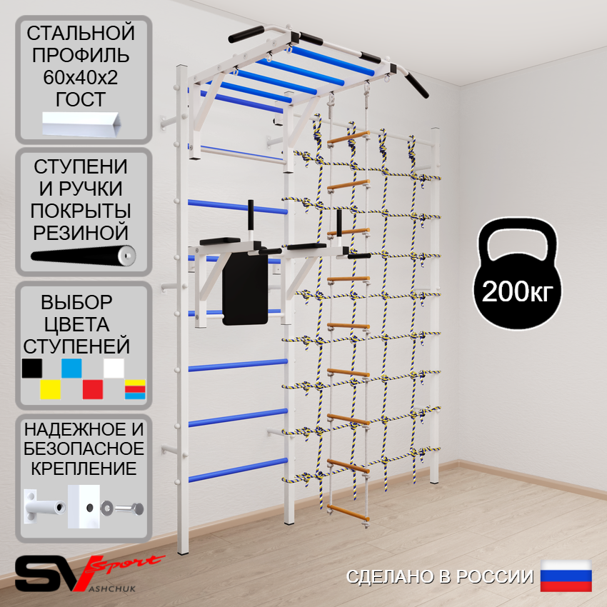КОМПЛЕКТАЦИЯ: Шведская стенка Sv Sport усиленная (профиль вертикальных стоек 60 х 40 х 2 мм), Турник Sv Sport рукоход к ШС, Брусья Sv Sport к ШС, Лестница веревочная, Канатный лаз.