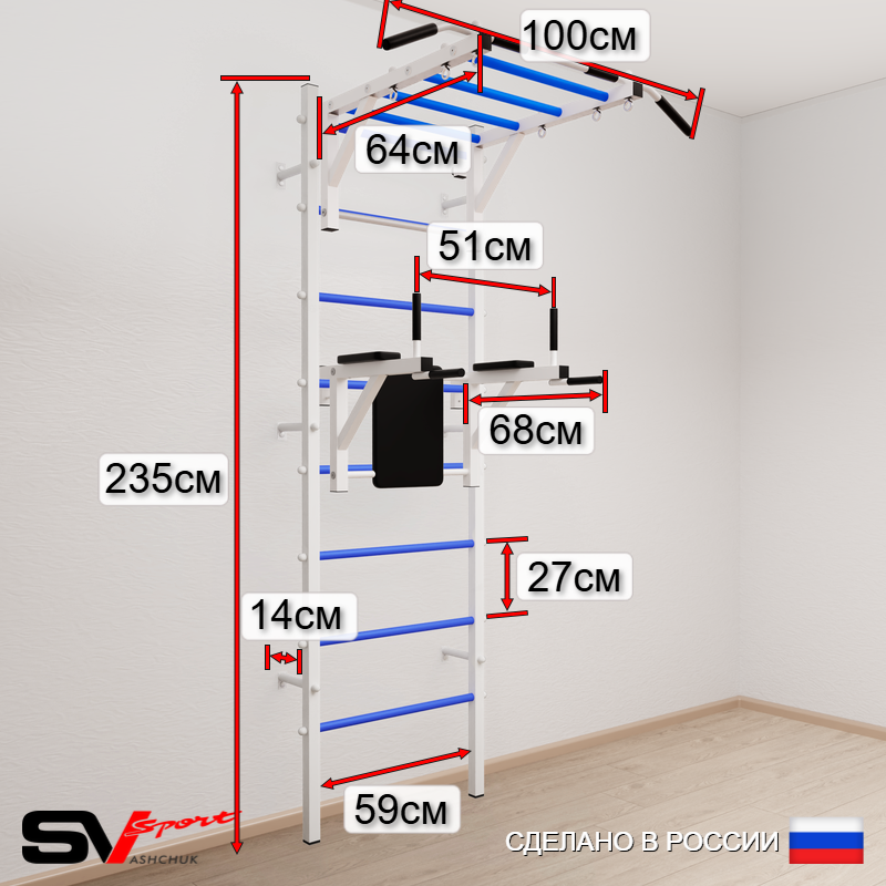 КОМПЛЕКТАЦИЯ: Шведская стенка Sv Sport усиленная (профиль вертикальных стоек 60 х 40 х 2 мм), Турник Sv Sport рукоход к ШС, Брусья Sv Sport к ШС, Лестница веревочная, Спортивный мат 100 х 100 х 10 см складной.