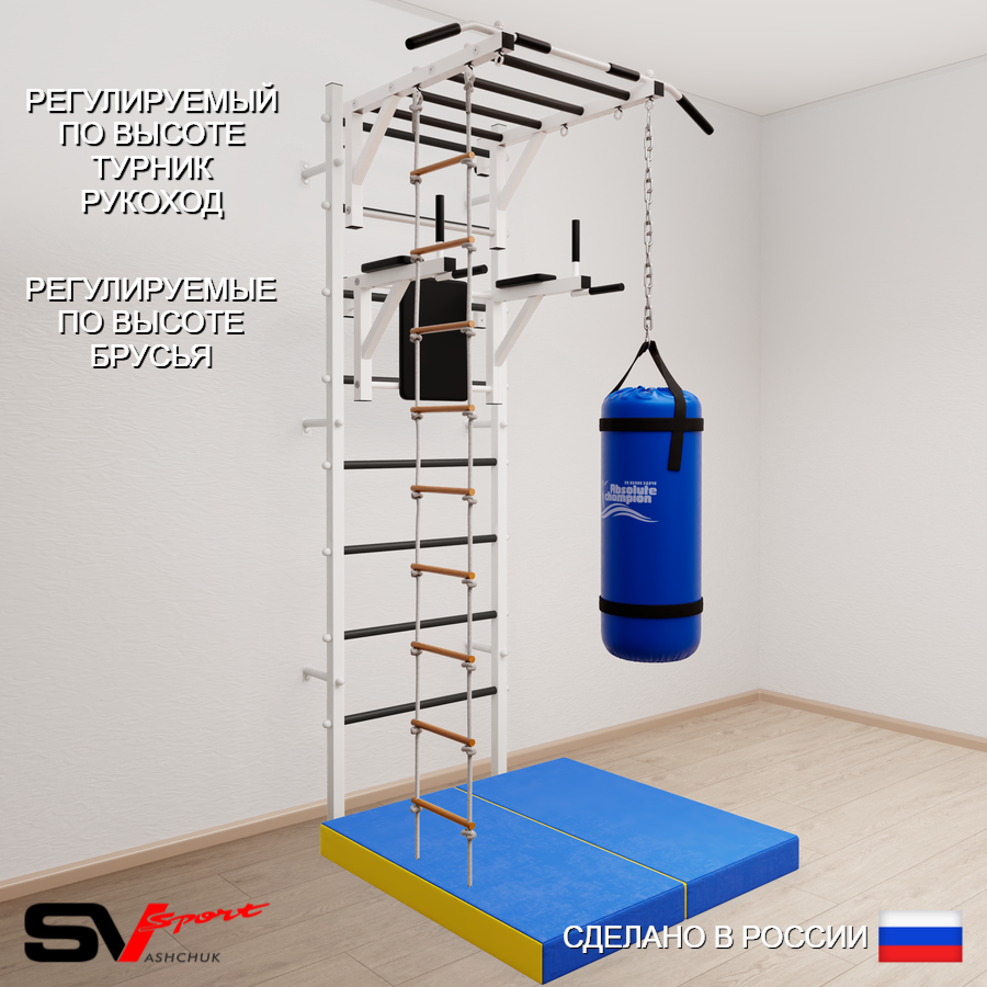КОМПЛЕКТАЦИЯ: Шведская стенка Sv Sport усиленная (профиль вертикальных стоек 60 х 40 х 2 мм), Турник Sv Sport рукоход к ШС, Брусья Sv Sport к ШС, Лестница веревочная, Цепь удлинитель 90см, Мешок боксерский 15кг, Спортивный мат 100 х 100 х 10 см складной.