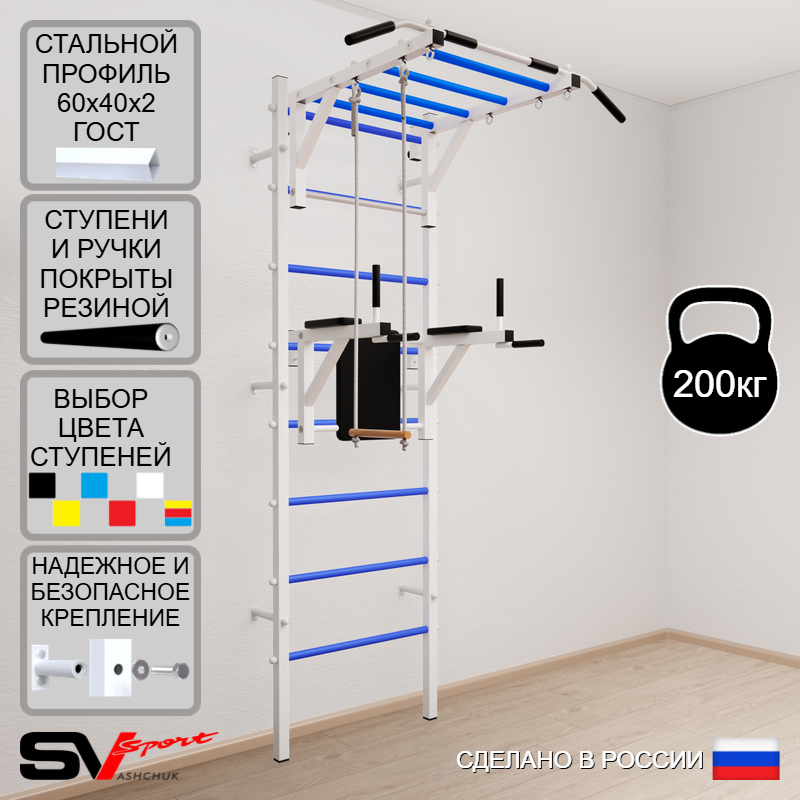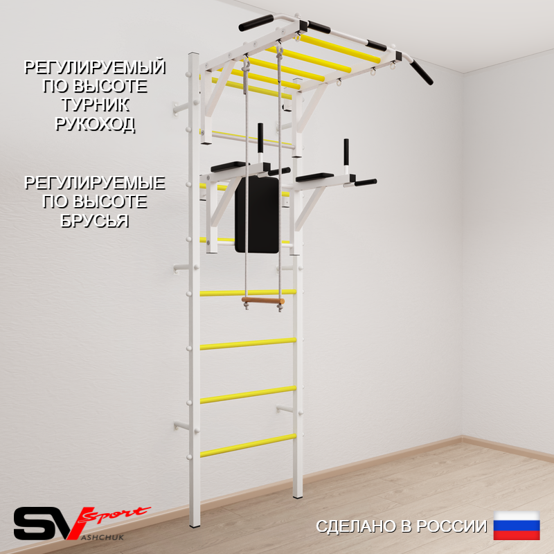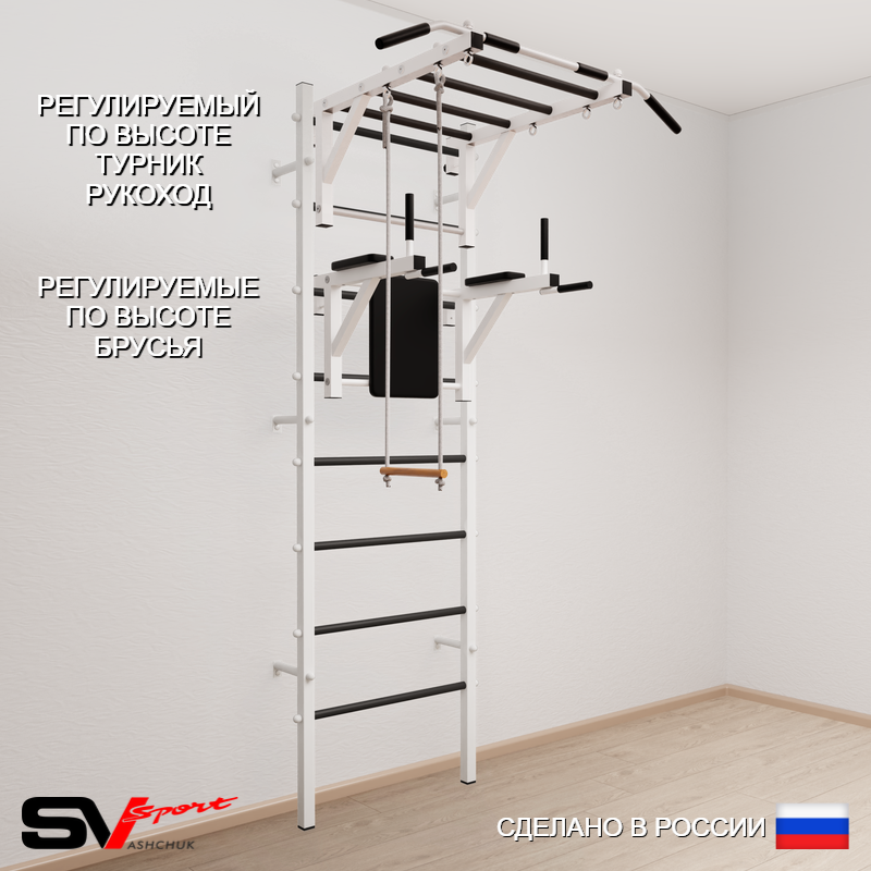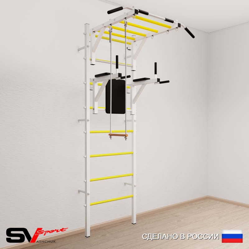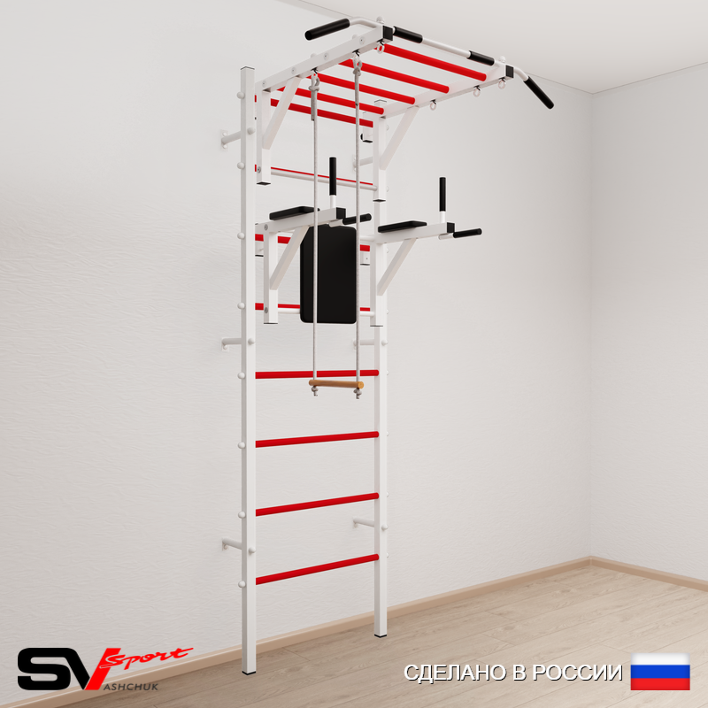 КОМПЛЕКТАЦИЯ: Шведская стенка Sv Sport усиленная (профиль вертикальных стоек 60 х 40 х 2 мм), Турник Sv Sport рукоход к ШС, Брусья Sv Sport к ШС, Трапеция.